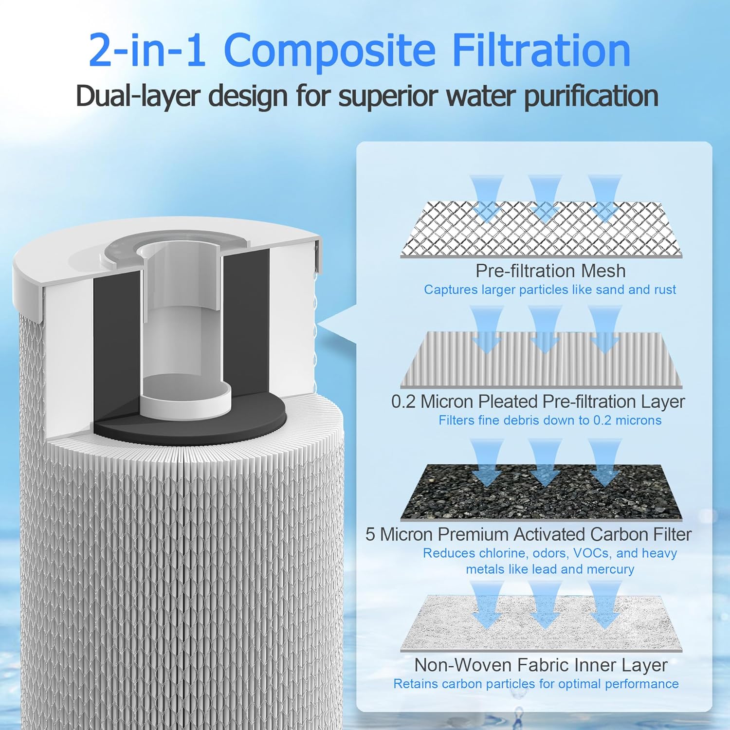 2-in-1 Composite Filtration: This water filter cartridge encompasses a dual-layer design with a pleated polyester outer layer and activated carbon internal layer, delivering the identical filtration efficiency as a 2-stage or 3-stage system. It successfully removes sand, rust, chlorine, VOCs, sure heavy metals, odors, and different chemical contaminants, guaranteeing secure and wholesome water. Get pleasure from premium water high quality even in restricted areas, offering peace of thoughts throughout your travels.