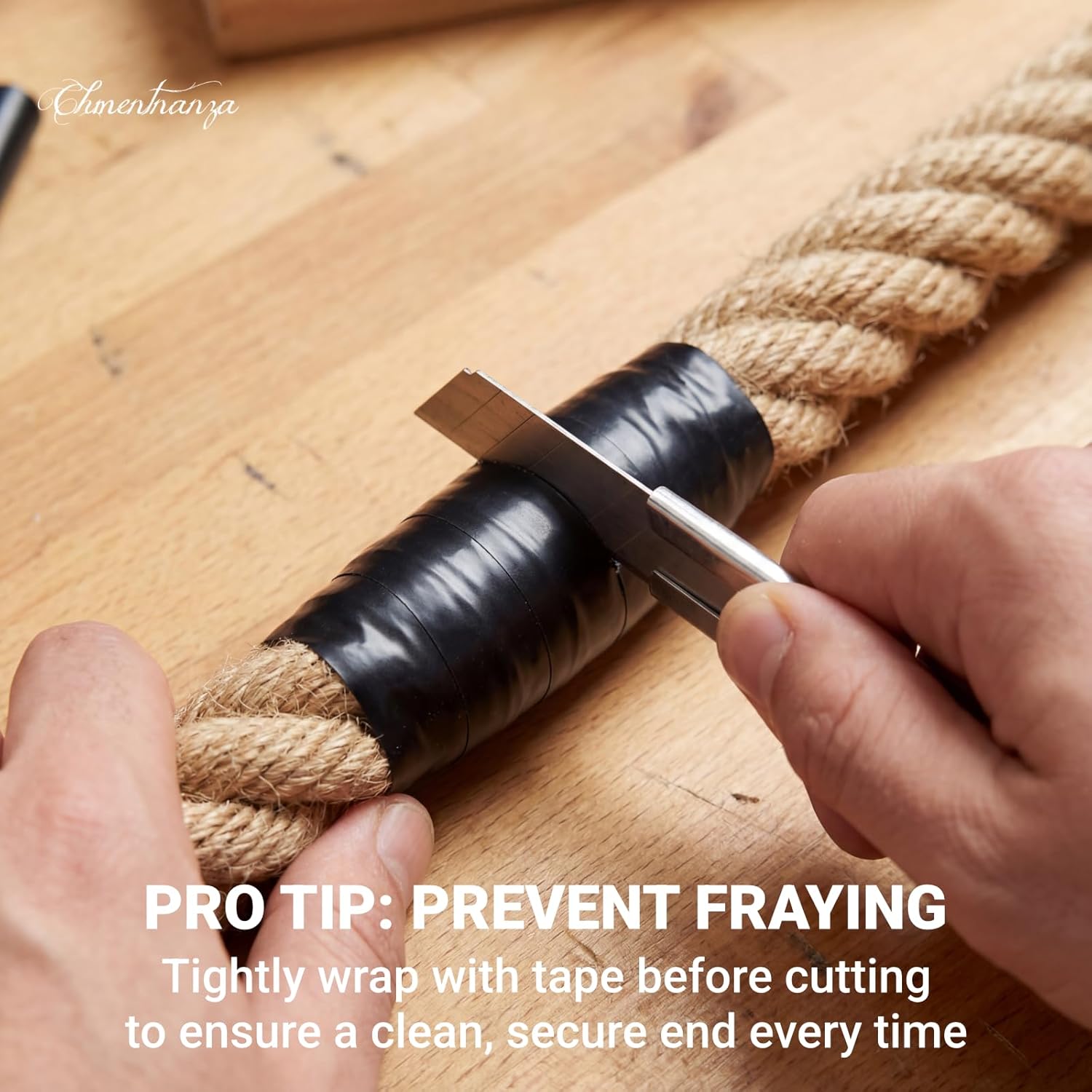 To maintain the strands safe, tightly wrap the part of hemp rope with tape first. Then, lower straight by the middle of the tape with a pointy knife to make sure a clear, fray-free finish.