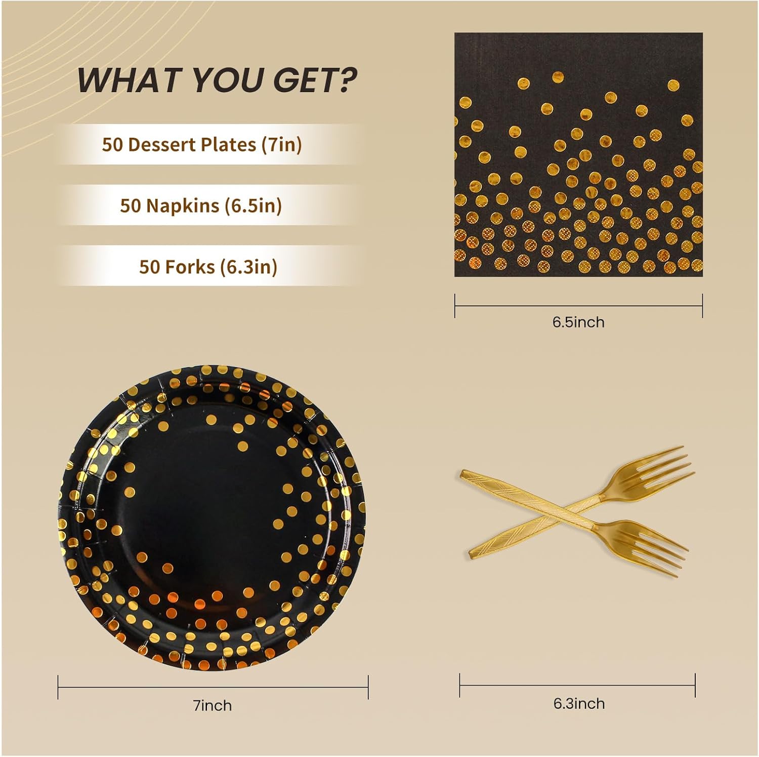 【PREMIUM GOLD FOIL DOT DESIGN】Our black and gold dot occasion paper plates and napkins are adorned with gold polka dots. Very fashionable and exquisite with beautiful and charming colours. Your friends will love this elegant and premium design.