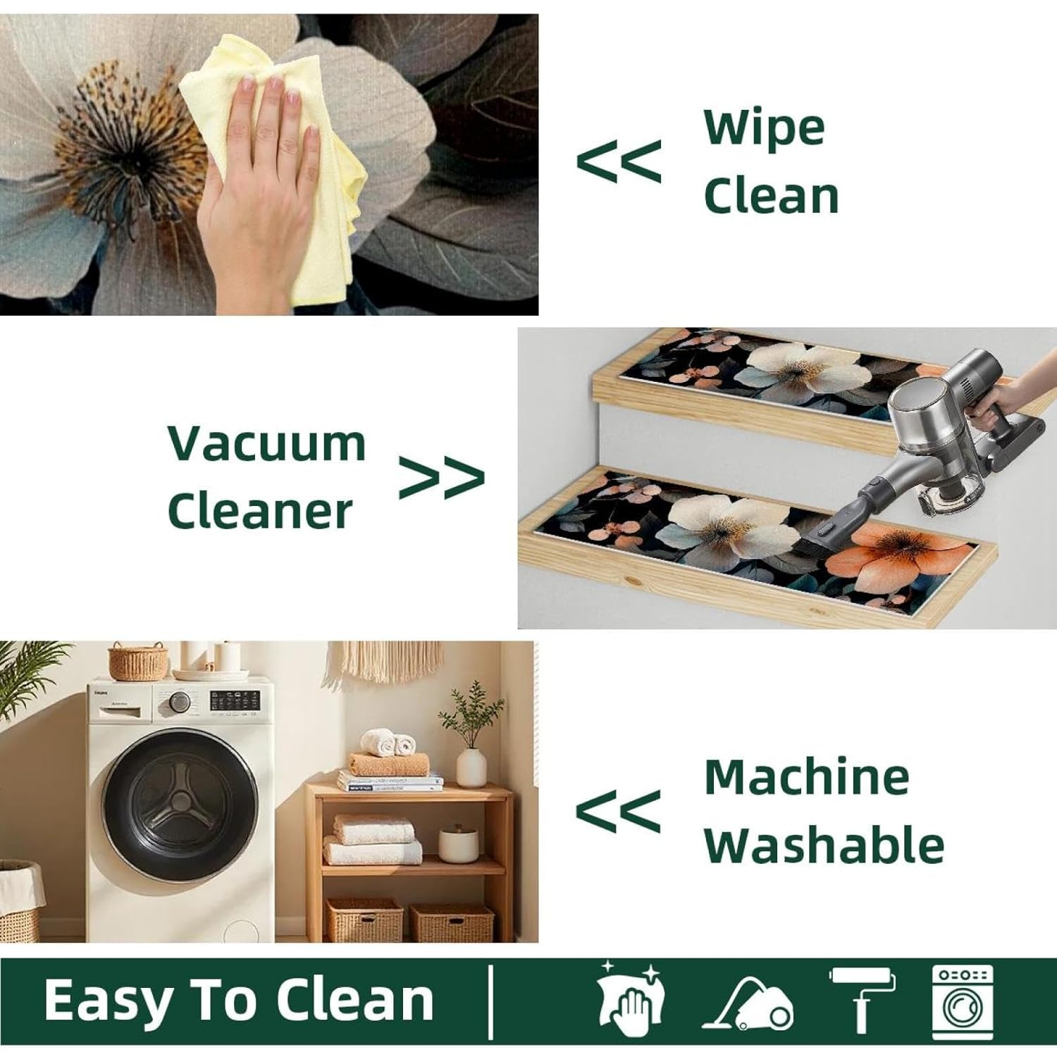 Washable & Straightforward Upkeep: Simply clear these stair treads with a fabric or vacuum for mud, particles, and pet hair. For deeper cleansing, toss them within the washer.