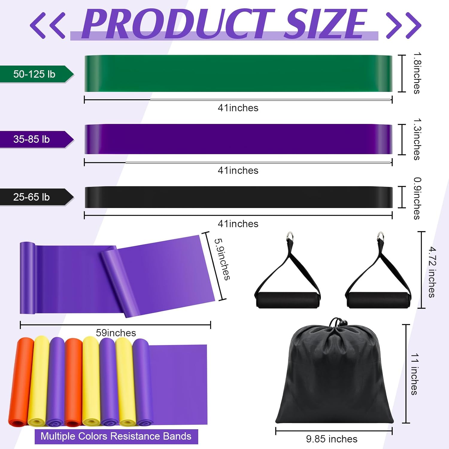 Correct Dimension to Use: Pull up bands measure about 41 × 0.18 × 0.9 / 1.3 / 1.8 inches that are black 25-65 lbs, purple 35-85 lbs, inexperienced 50-125 lbs, the material resistance bands about 30 × 3.2 inches, the a number of colours resistance bands about 59 × 5.9 inches, the band foam handles about 4.72 inches and the bag is about 11 × 9.85 inches, appropriate for women and men on varied events