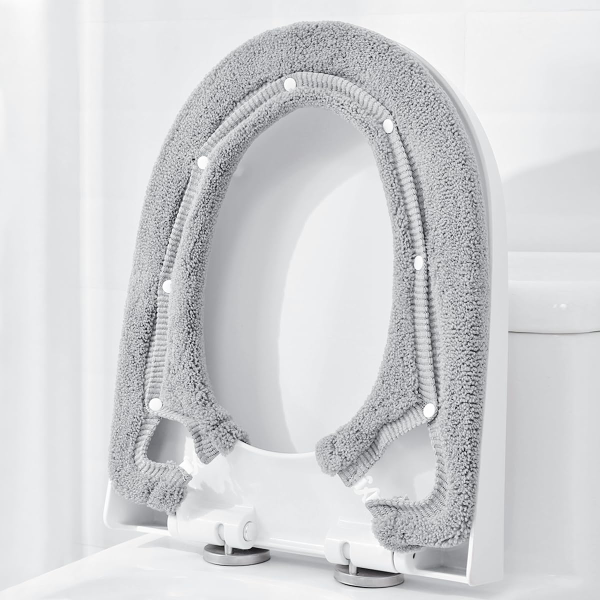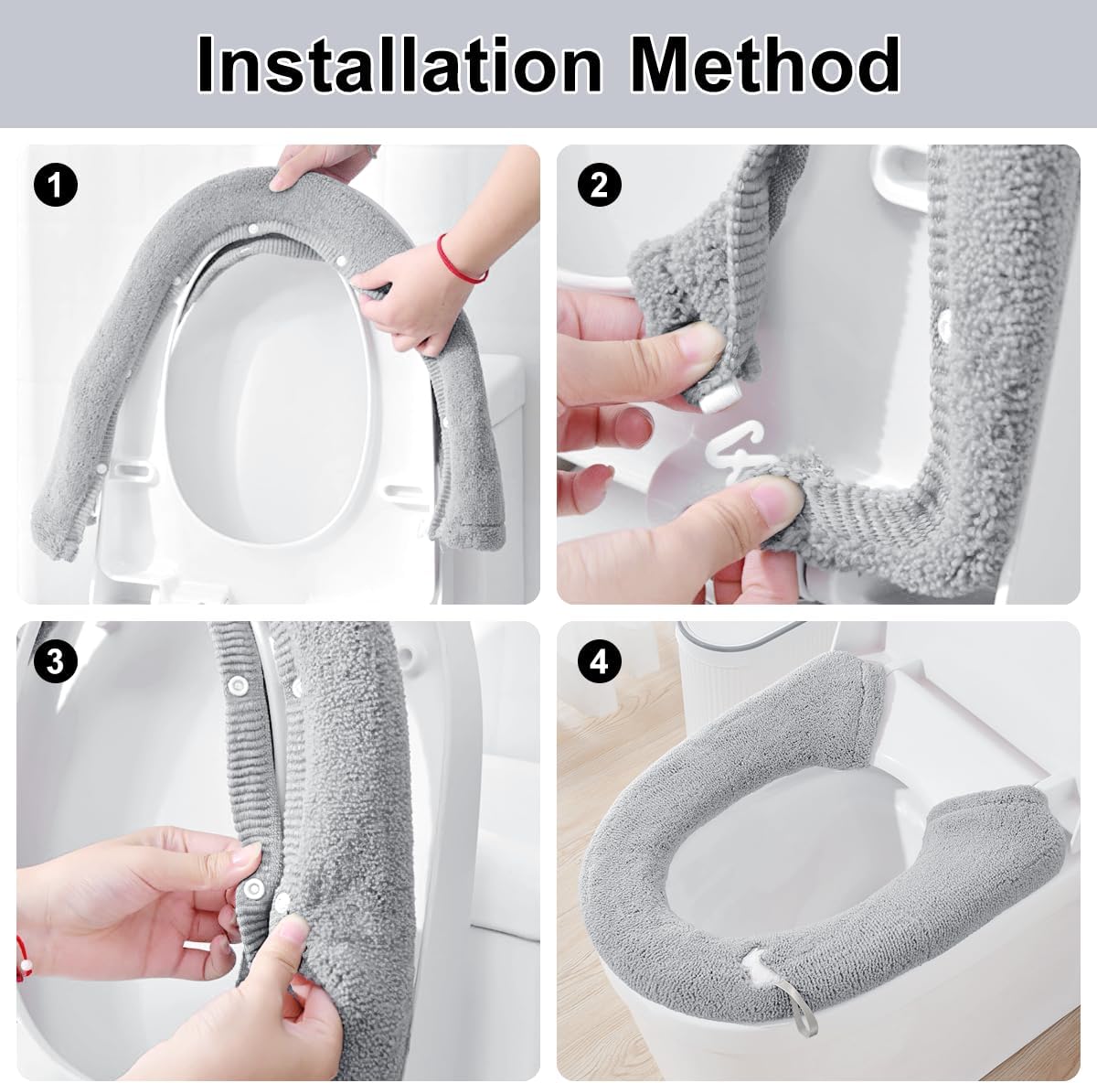 Straightforward to Set up: 1.Place the bathroom seat cowl over the bathroom lid after elevating it up. 2.Snap all of the corresponding snaps round the bathroom lid. 3.Hook the highest plastic ring to the elastic on every