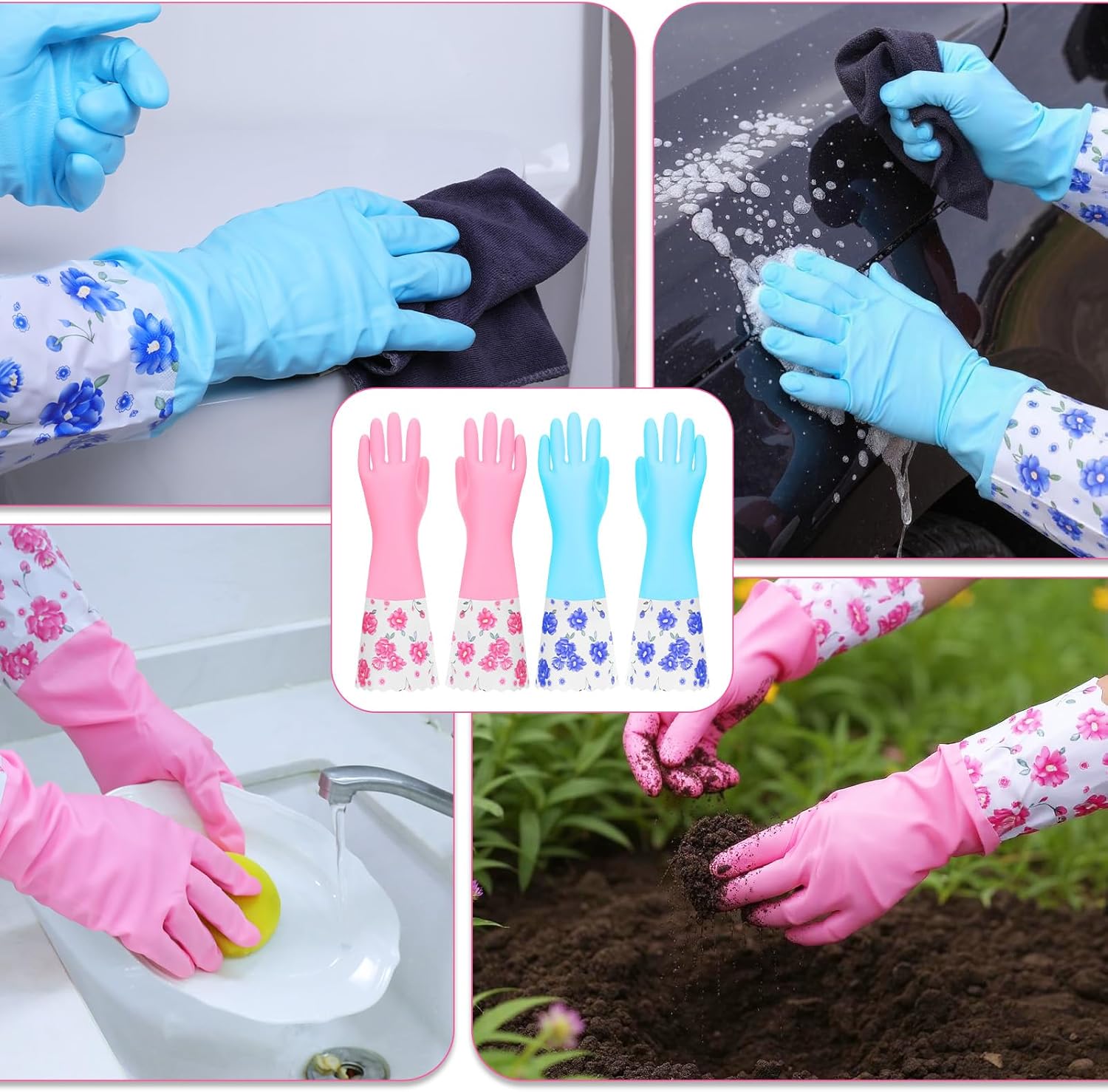2 Pairs Rubber Cleansing Gloves Family Kitchen Dishwashing Gloves Lengthy Cuff Glove with Cotton Flocked Liner Reusable Waterproof Non-Slip Family Glove for Lavatory Laundry Gardening Reward for Mother