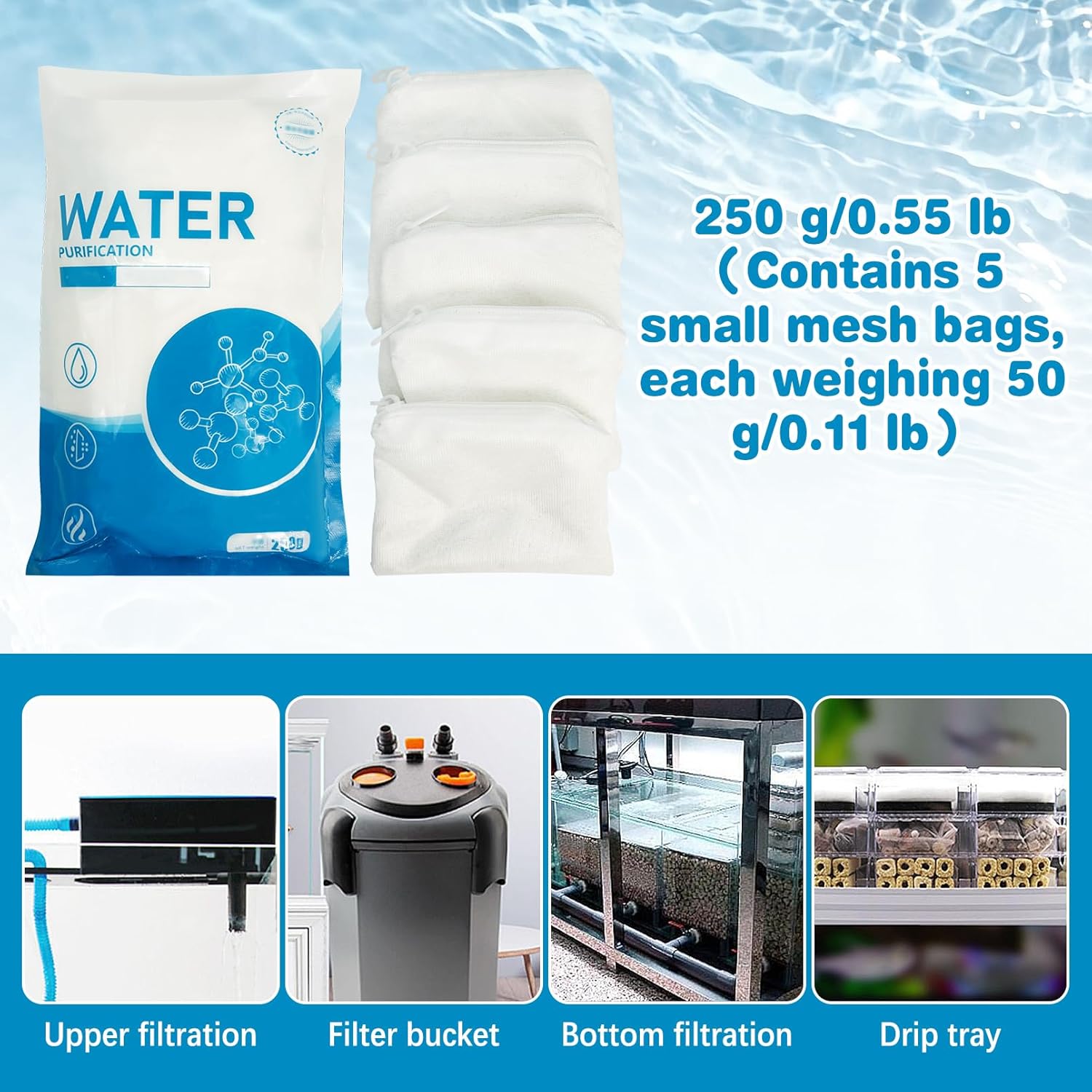 Relevant Scope: Appropriate for small filtration , corresponding to prime filtration, filter buckets, backside filtration, or drip trays. This aquarium filter weighs 250g/0.55 lbs and accommodates 5 mesh baggage, every weighing 50g. The mesh baggage guarantee no leakage and can be utilized in each freshwater and saltwater aquariums (500ml of filter media is required for each 300 liters of water)