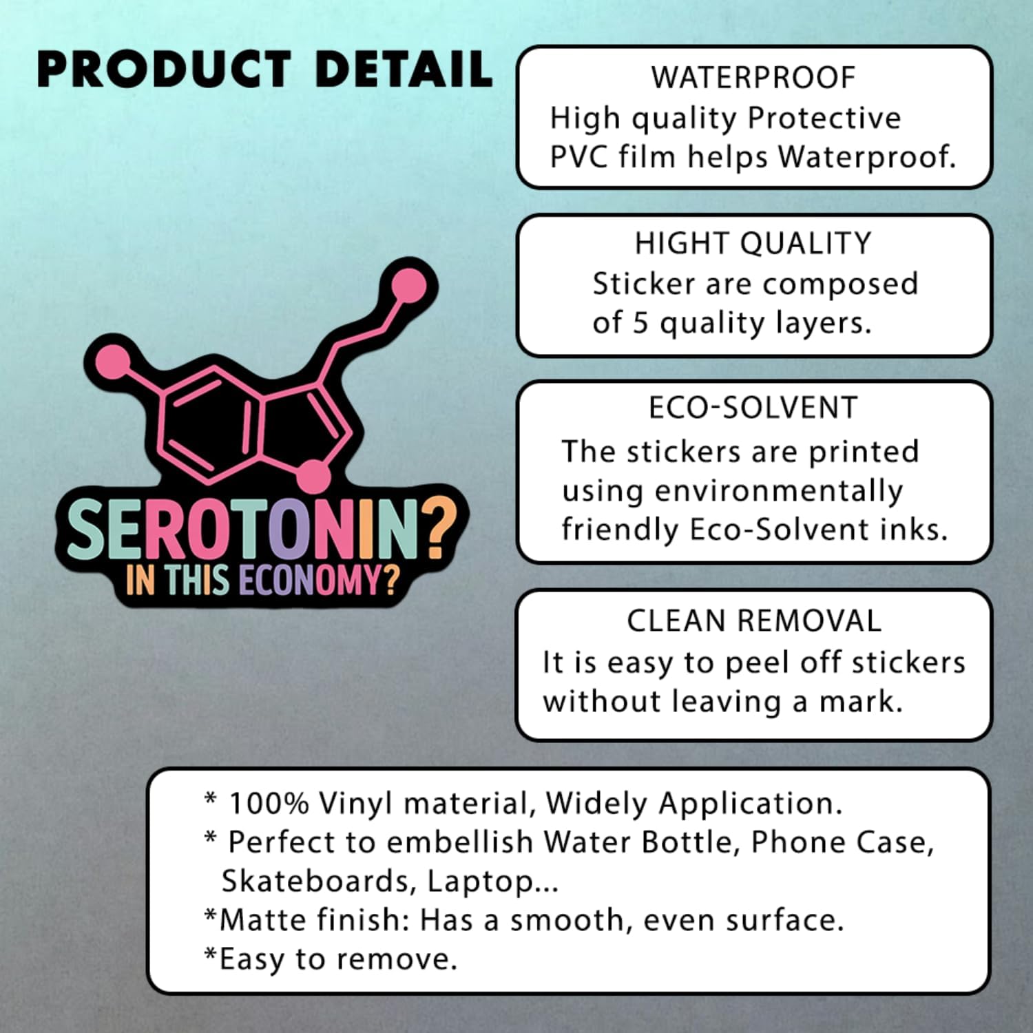 DESIGN FEATURES: Black sticker with colourful rainbow textual content and serotonin molecule design, excellent for expressing psychological well being humor with fashion