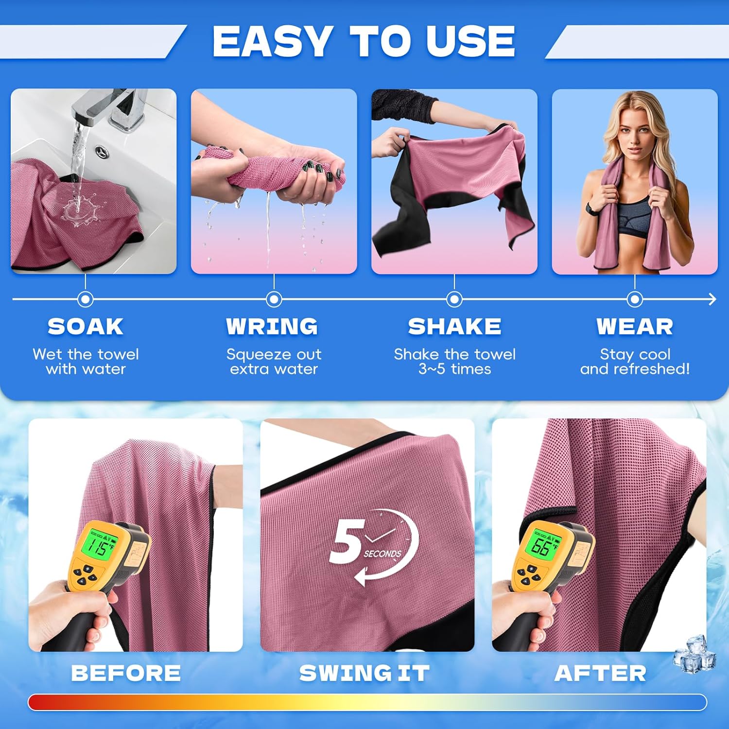 UPF 50+ Solar Safety & Versatile Cooling Towels for Sports activities: These cooling cloths block 98% of UV rays whereas staying comfortably cool. Ideally suited for runners, golfers, and beachgoers, our cooling towels for sports activities mix solar safety with superior cooling expertise.