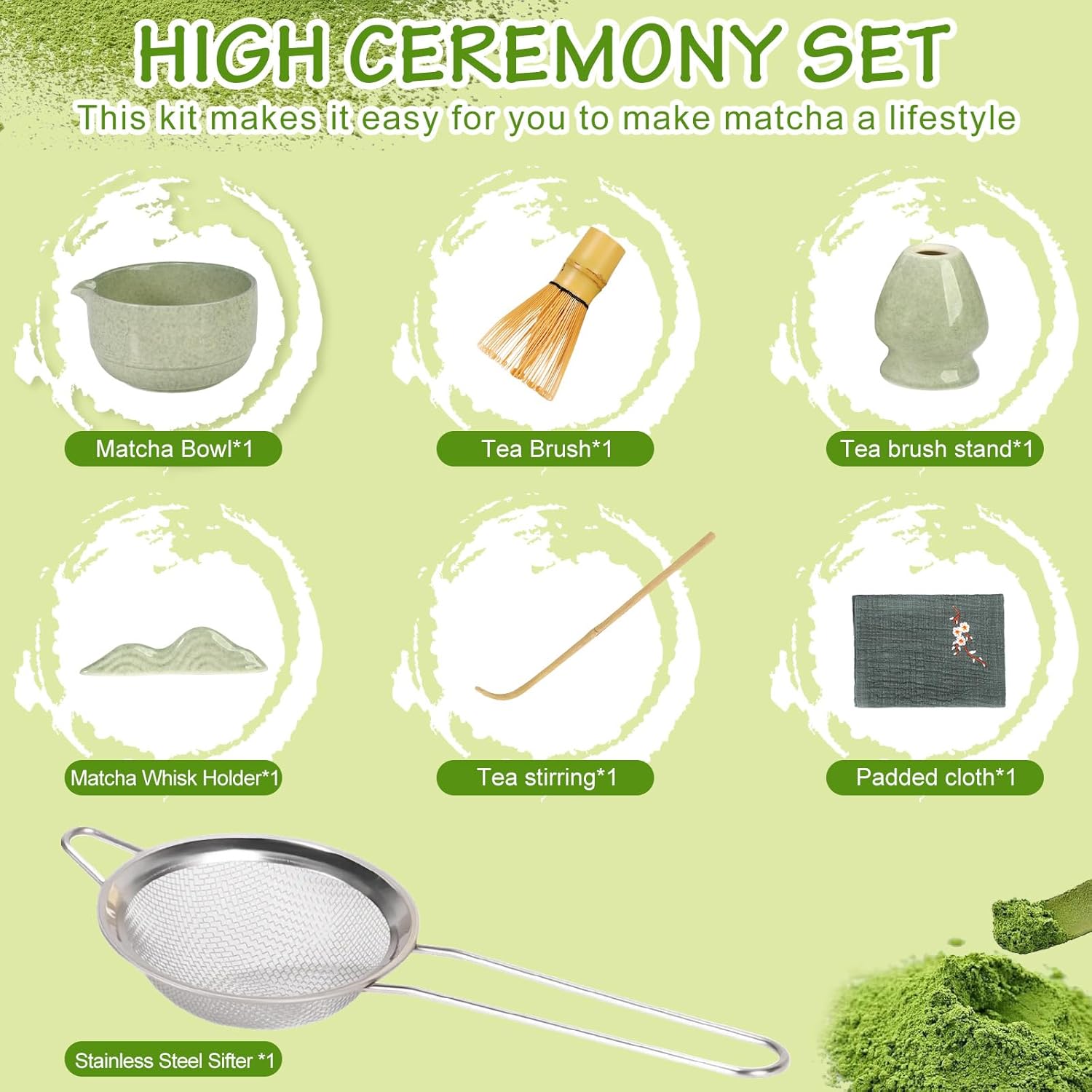 đ”ă7PCS PERFECT MATCHA STARTER KITăDive into the world of matcha straight away! This all-inclusive 7-piece matcha set package have each instrument you want:a whisk,ceramic bowl,scoop,sifter,whisk holder,spoon holder and a tea towel.All the pieces required for a seamless matcha ritual at residence.The matcha whisk and bowl set is right for making conventional and scrumptious matcha at residence and within the kitchen.