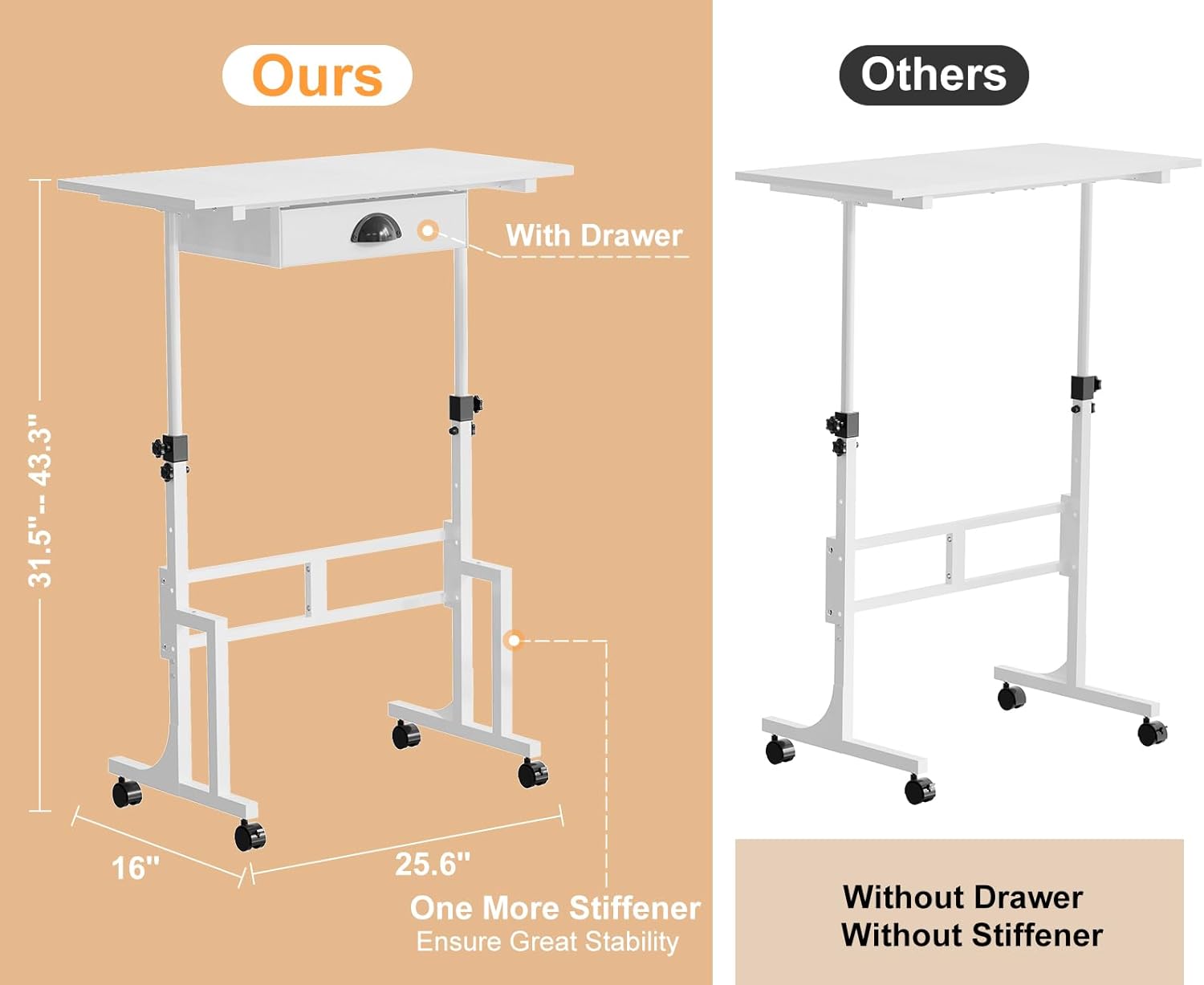 This can be a small white standing desk that options: adjustable /sturdy /secure /straightforward to maneuver.