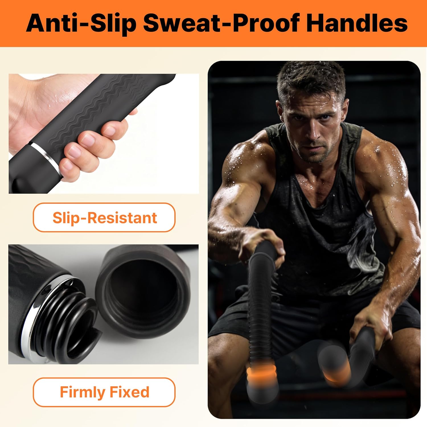 【Ergonomic Anti-Slip Handles】Our ropeless battle ropes characteristic ergonomically designed, sweat-resistant, and non-slip handles for superior consolation and stability throughout intense HIIT, battle rope exercises, and lengthy coaching classes. Cut back hand fatigue, improve management, and guarantee protected, efficient coaching for women and men at house or within the gymnasium