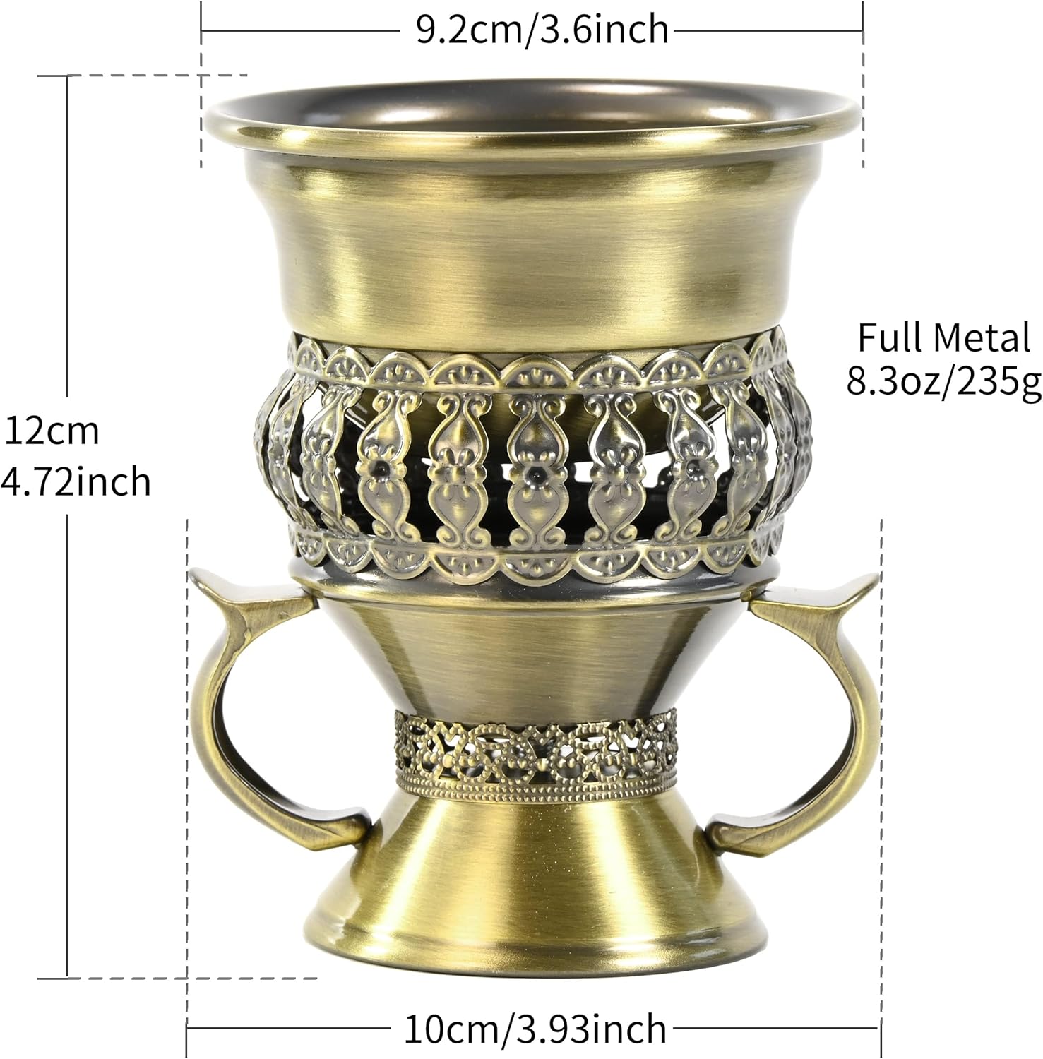 Materials: Full MetalSize: Top 6.7 inch, Diameter 2.4 inchWeight: 0.31lbs / 130gMetal Materials: The best metallic glazed with clean contact, handles are made from full materials and glorious workmanshipPackage Included: 1 x incense burner, 1 x set of tongs, 1 x detachable ash-Tray