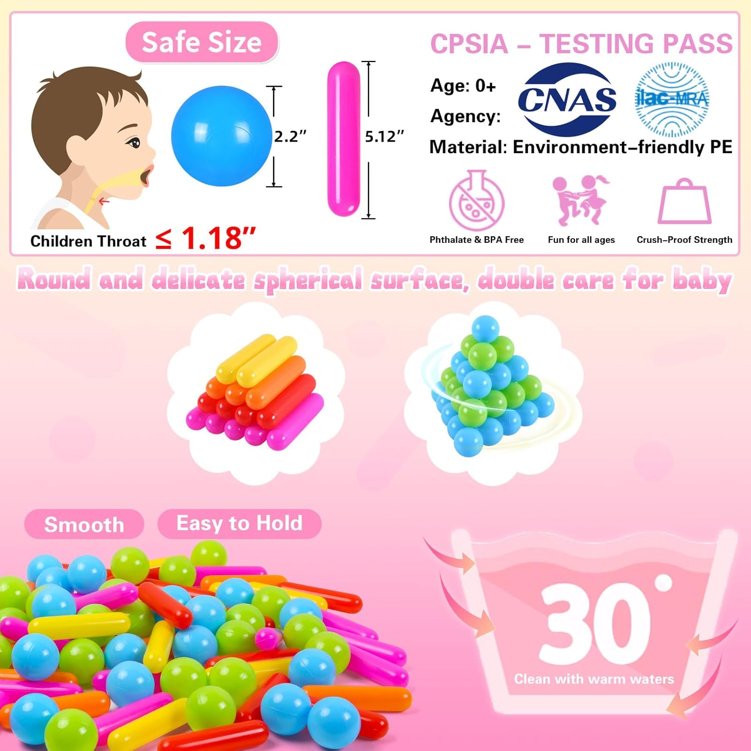 SAFETY : Pack of 120 balls (70 lengthy balls, 50 spherical balls) , our Heopeis balls are Phthalate & BPA Free, Created from non-toxic materials, non-recycled & non-PVC plastic, BPA free, Phthalate free and lead free. Our certificates are really helpful for kids 0+.