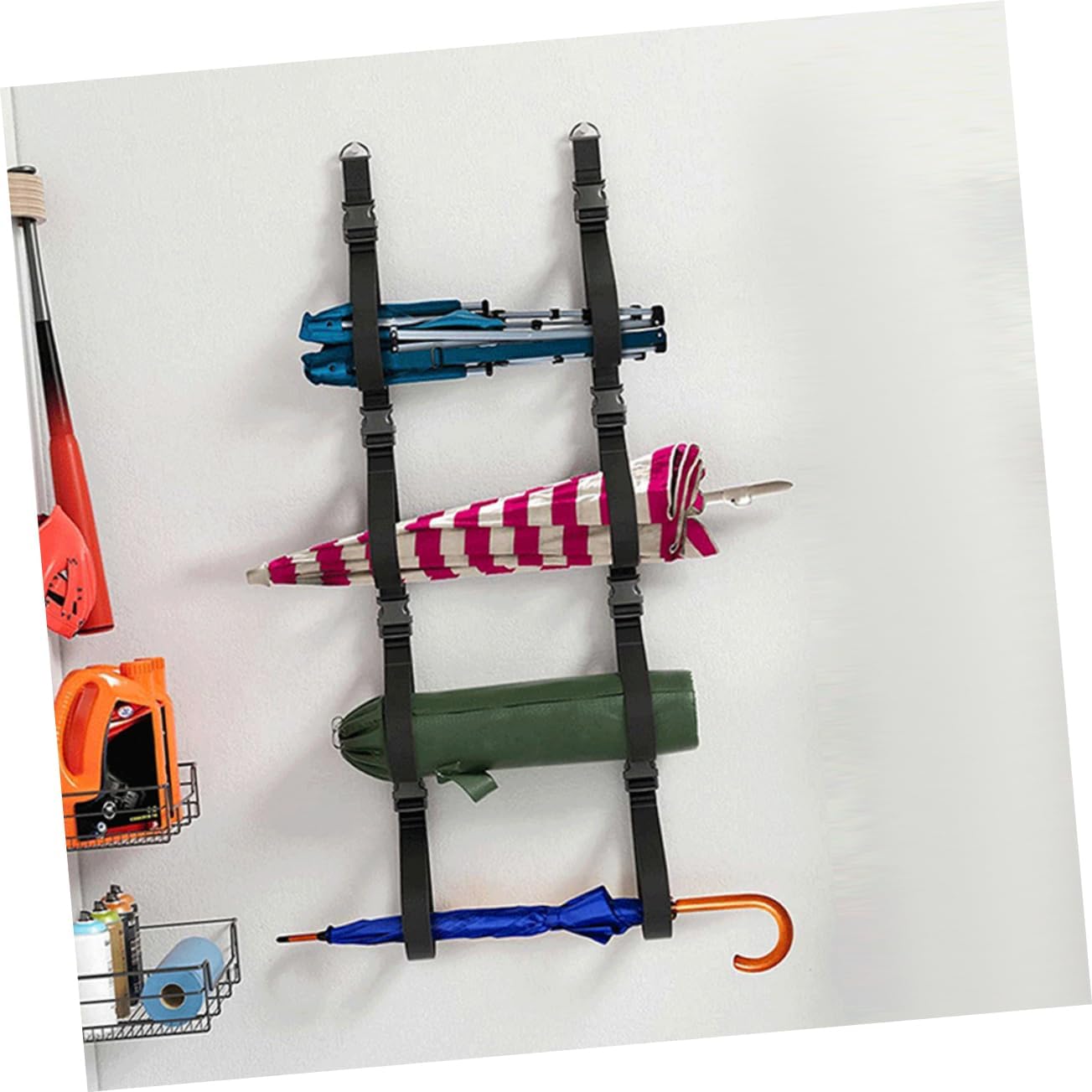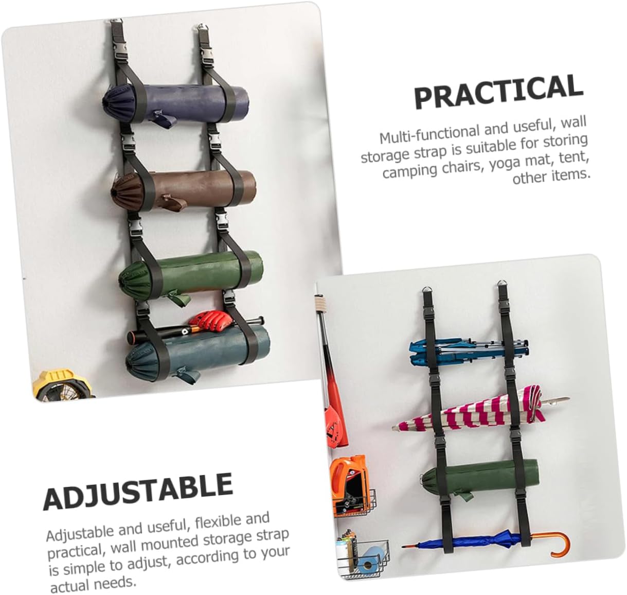 -Multi-functional and helpful, wall storage strap is appropriate for storing tenting chairs, yoga mat, tent, different objects wall storage strap for hanging.