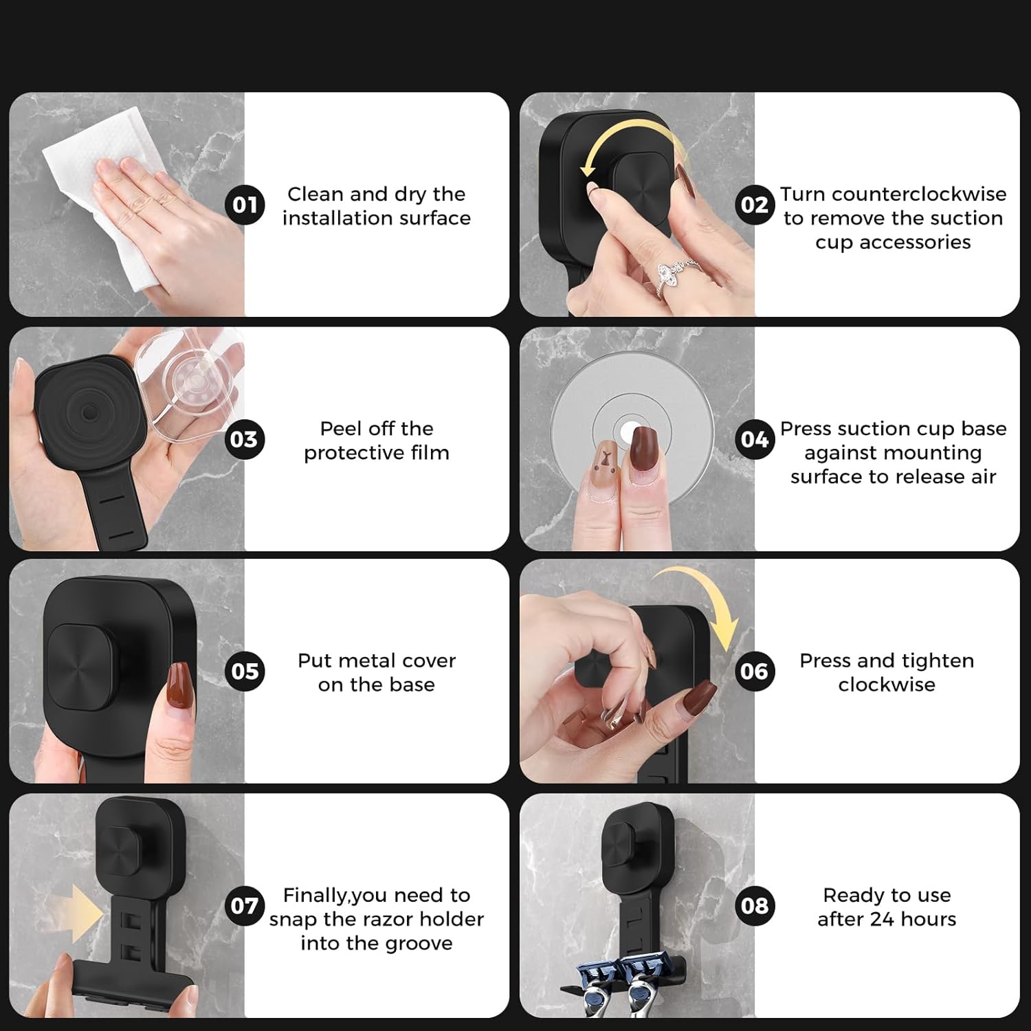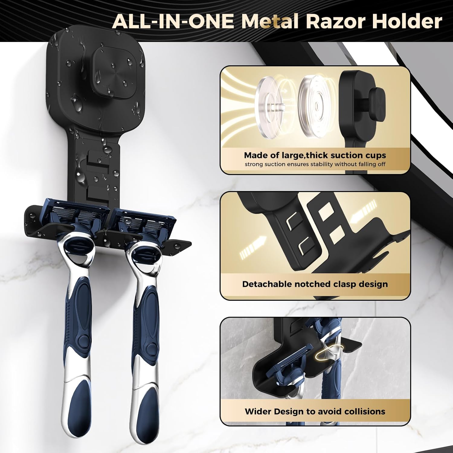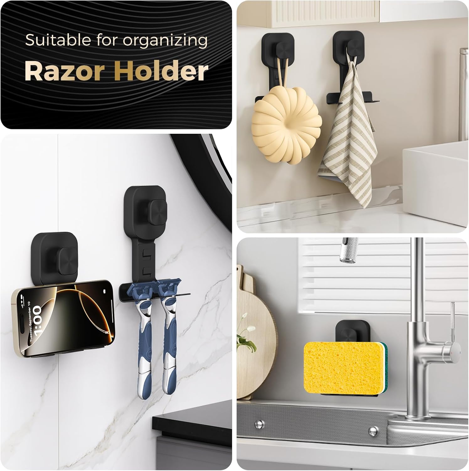 【Powelful Suction for Unshakable Maintain】BKV razor holder options an ultra-strong suction cup base,impressed by the precept of octopus suction cups,with a load-bearing capability of as much as 12 kilos.Whether or not it is a heavy razor or a number of toilet necessities,this suction hook stays firmly connected to clean surfaces like glass,tiles,or mirrors,guaranteeing no unintentional drops—even in humid bathe environments