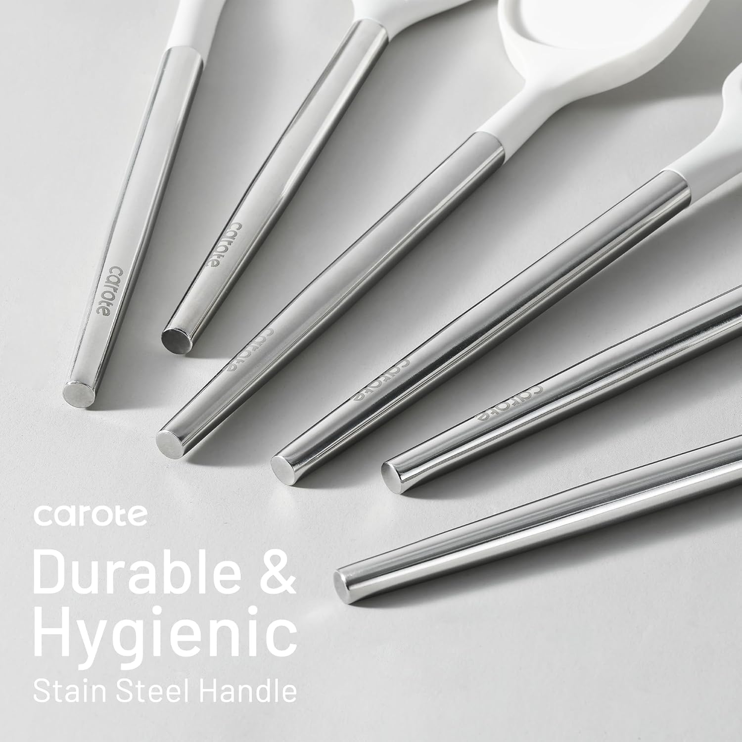 CAROTE 9PCS Kitchen Utensils Set, Silicone Kitchen Utensils Set with Stainless Steel Handle for Non-Stick Cookware Set, Dishwasher Safe, White