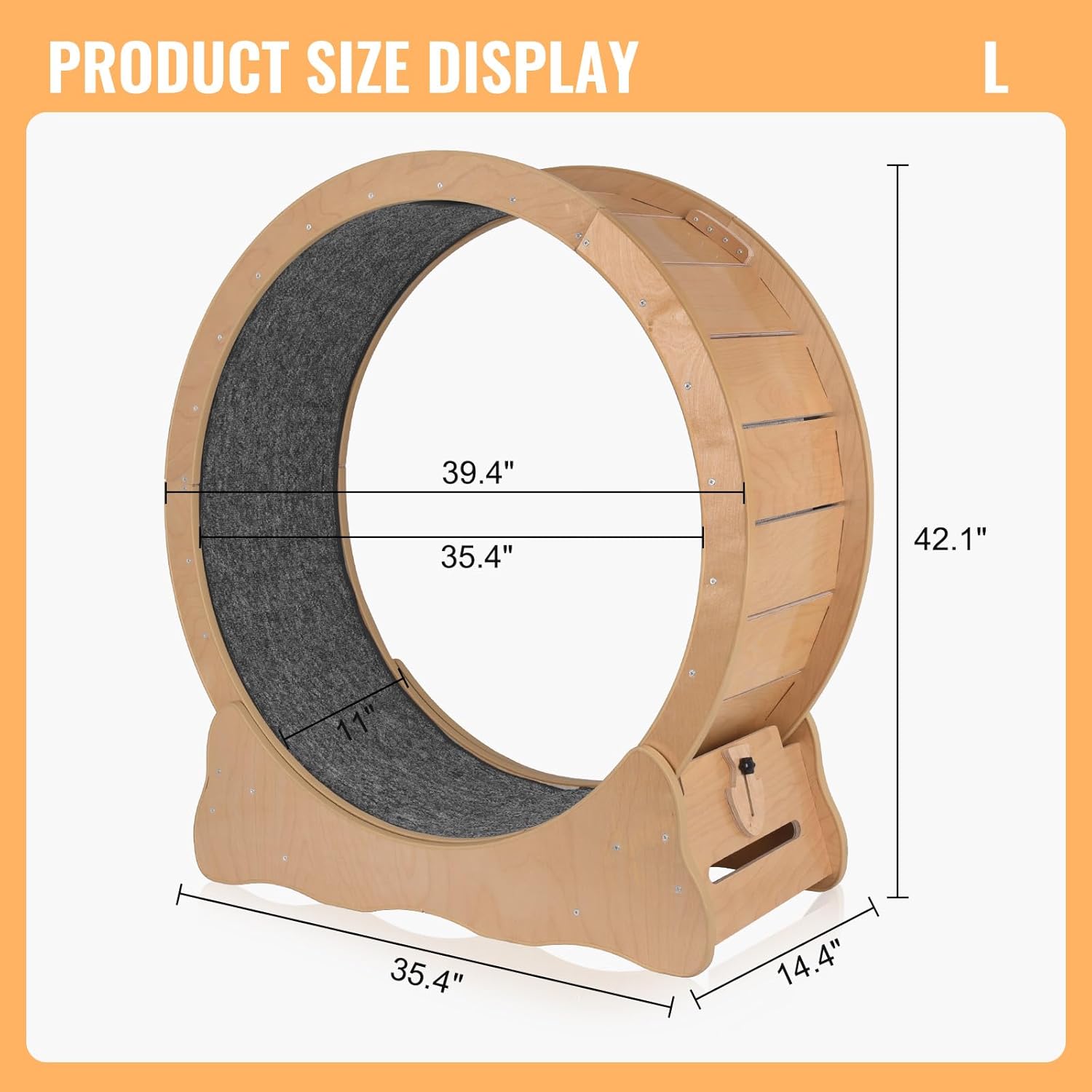 【39.4-inch Cat Train Wheel】Total 39.4″L x 14.4″W x 42.1″H, Wheel 35.4″D x 11.02″W, the cat wheel is appropriate for all cats weighing 13.2 lbs to 16.5 lbs. This spacious cat wheel supplies ample room in your indoor cats to run, stretch, and play, making it a perfect train answer for energetic felines.
