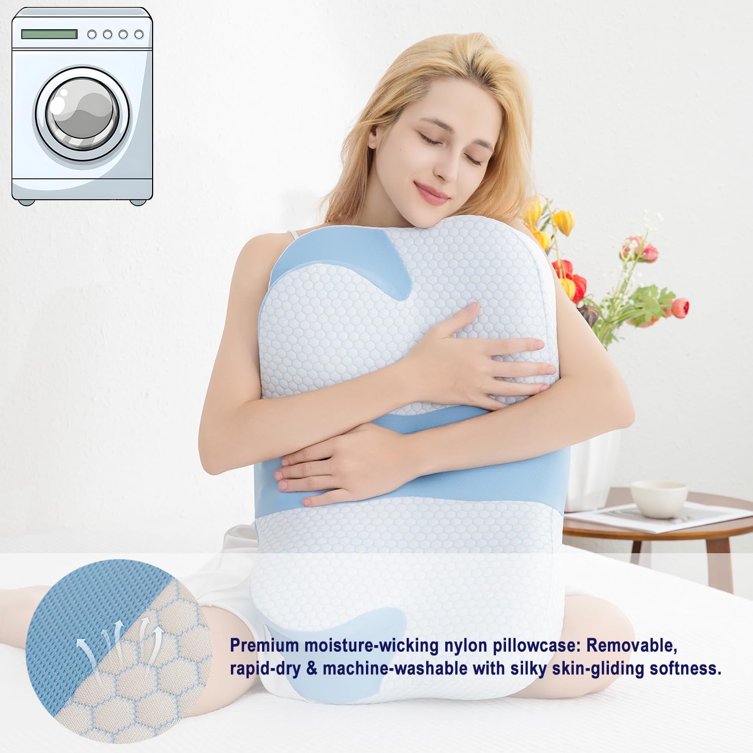 Cervical Neck Pillows For Pain Relief,Soft Orthopedic Memory Foam Pillows-Dual Height Neck Support Pillow for Side,back,Stomach Sleepers with Breathable Cover&Firmness Adjustment Button (BLUE)