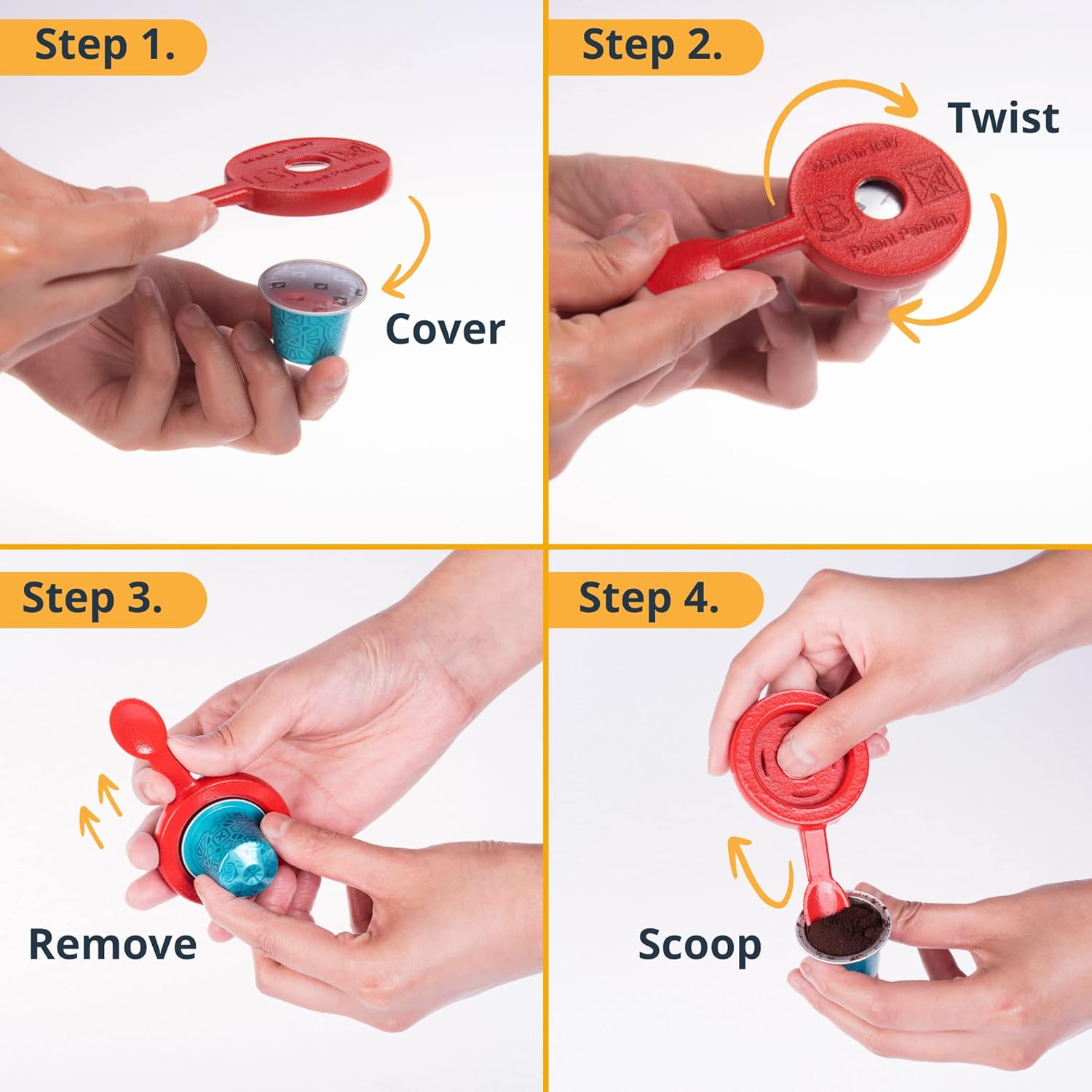 【Harm Prevention】No extra sharp instruments wanted. Solely 4 straightforward steps. (1)Place the cutter over the pod’s cowl (2)Apply a gentle power and twist the opener (3)Peel off the espresso pod cowl (4)Scoop out espresso powder with the small spoon on the entrance. Success assure.