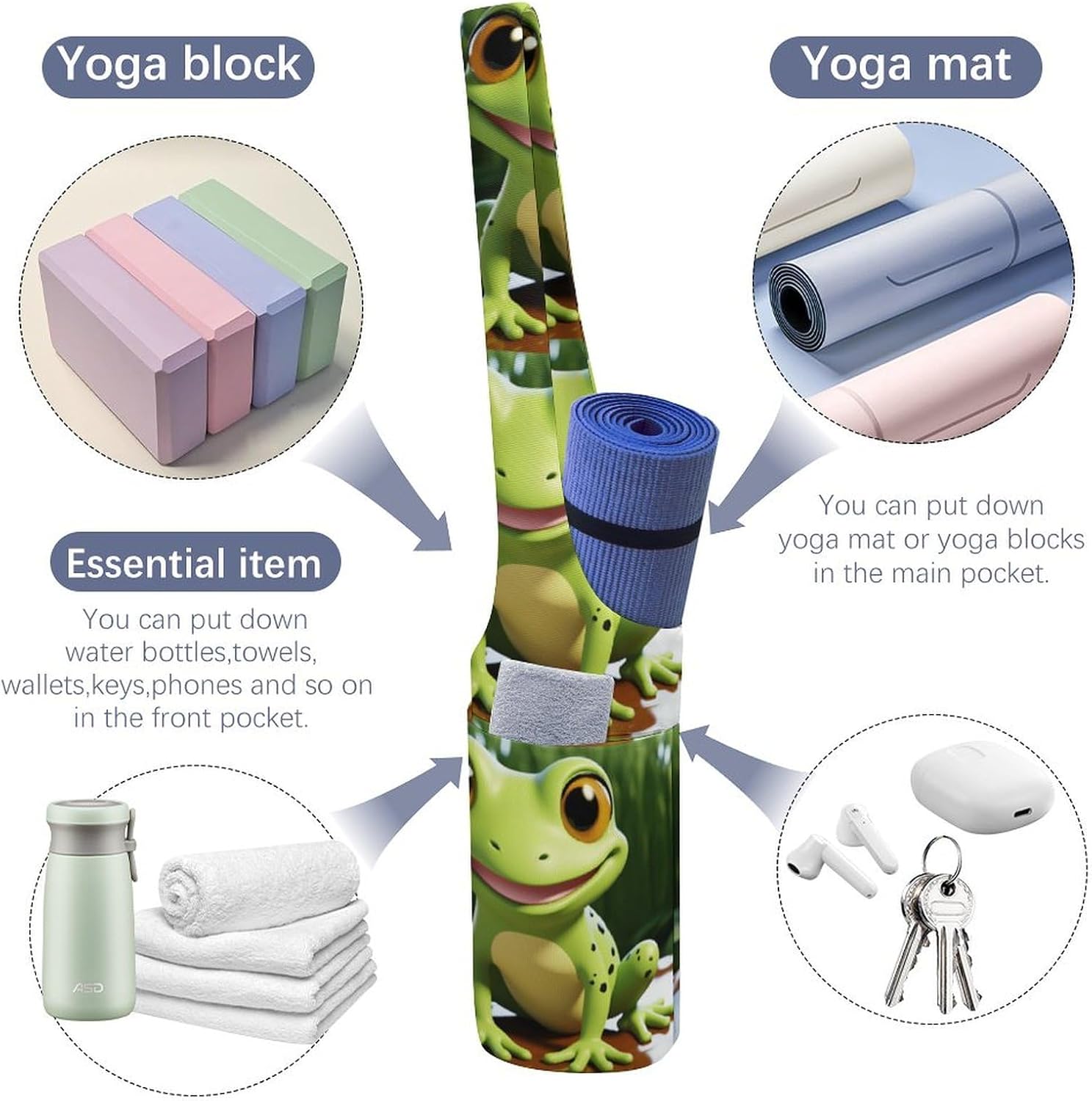 Cute Frog Yoga Mat Bag, Durable Canvas Yoga Mat Storage Bag with Water Bottle Pocket And Bottom Wet Bag, Fits Most Size Yoga Mats