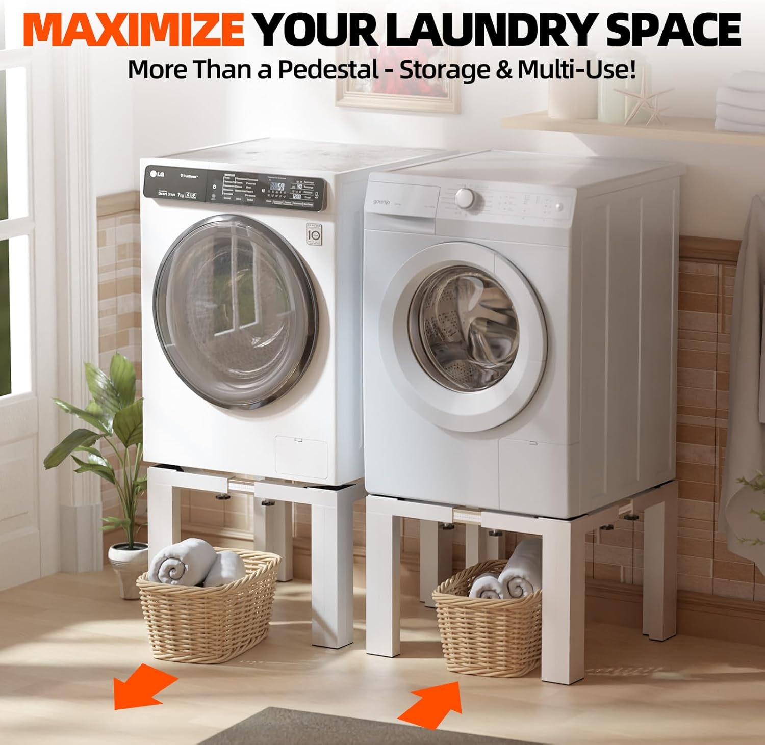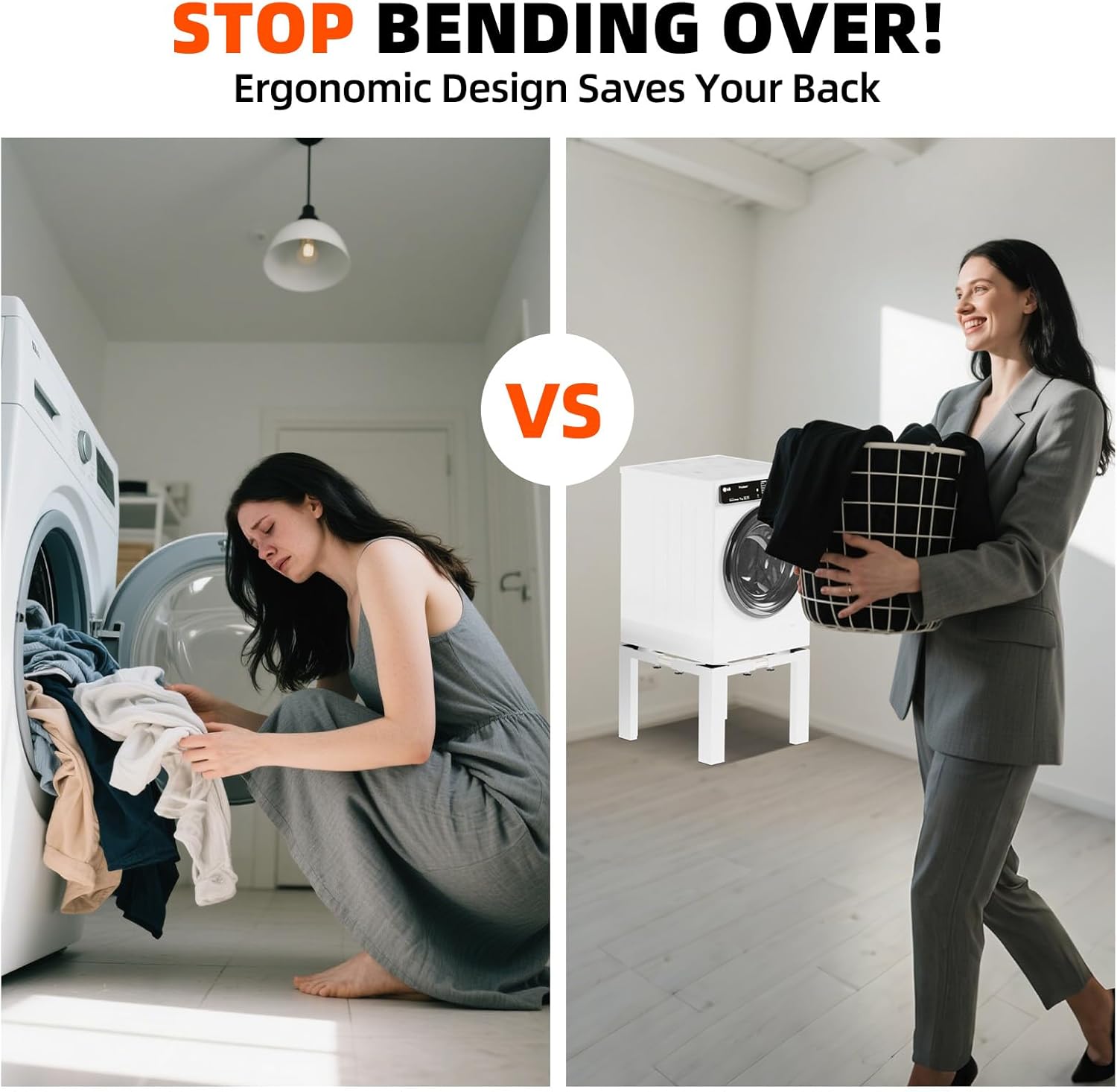 Common Compatibility: Adjustable width (17.7″-31″) matches all normal washers, dryers, dishwashers, and fridges. The 16″ elevated design solves widespread frustrations—prevents again pressure from bending, eases ground cleansing, raises home equipment for simpler wire entry, and creates house to retailer detergents or robotic vacuums beneath