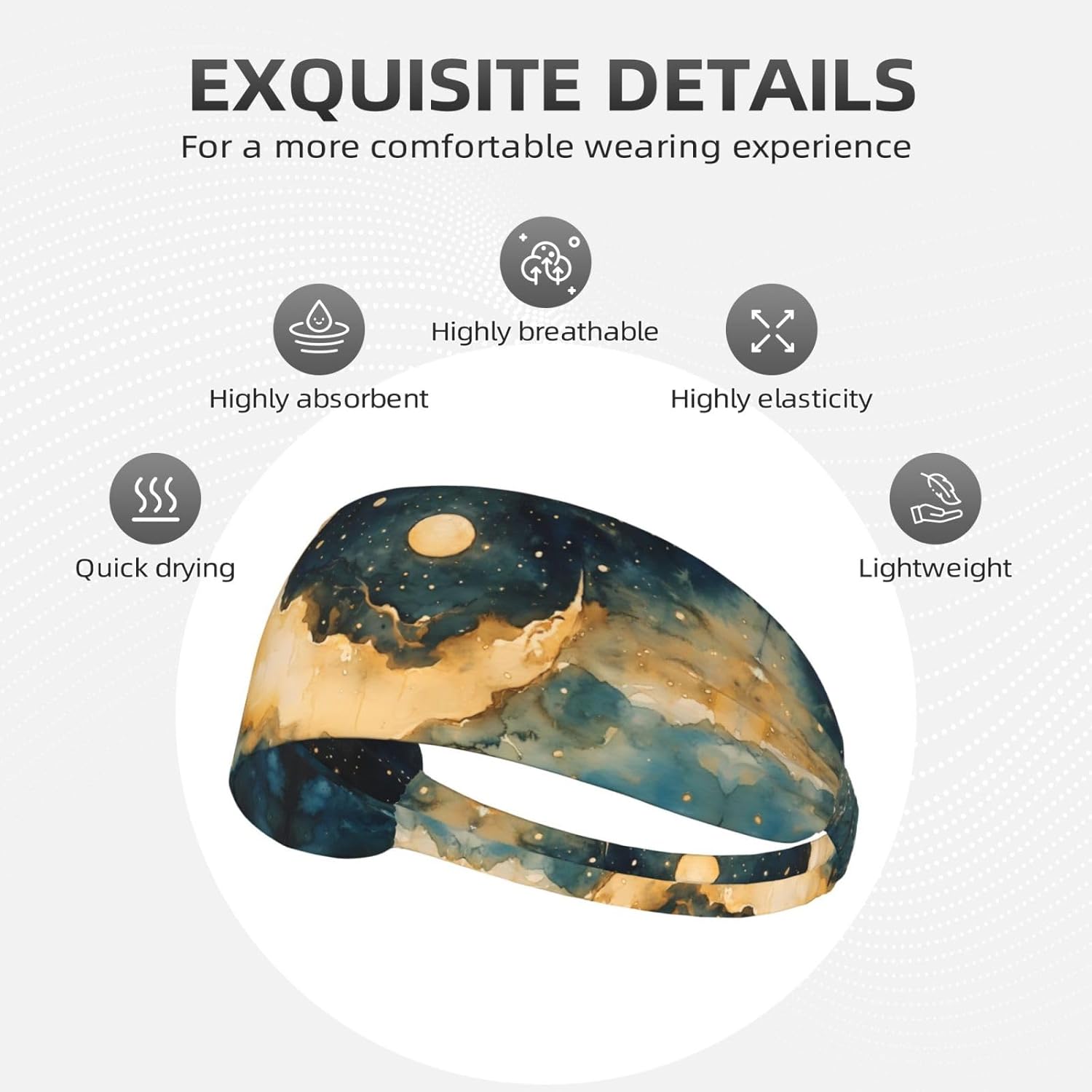Moon Watercolor Patterned sports activities headband, manufactured from 95% polyester and 5% spandex blended cloth, comfortable and breathable, fast sweat absorption, comfy to put on, preserving you dry and cozy throughout train