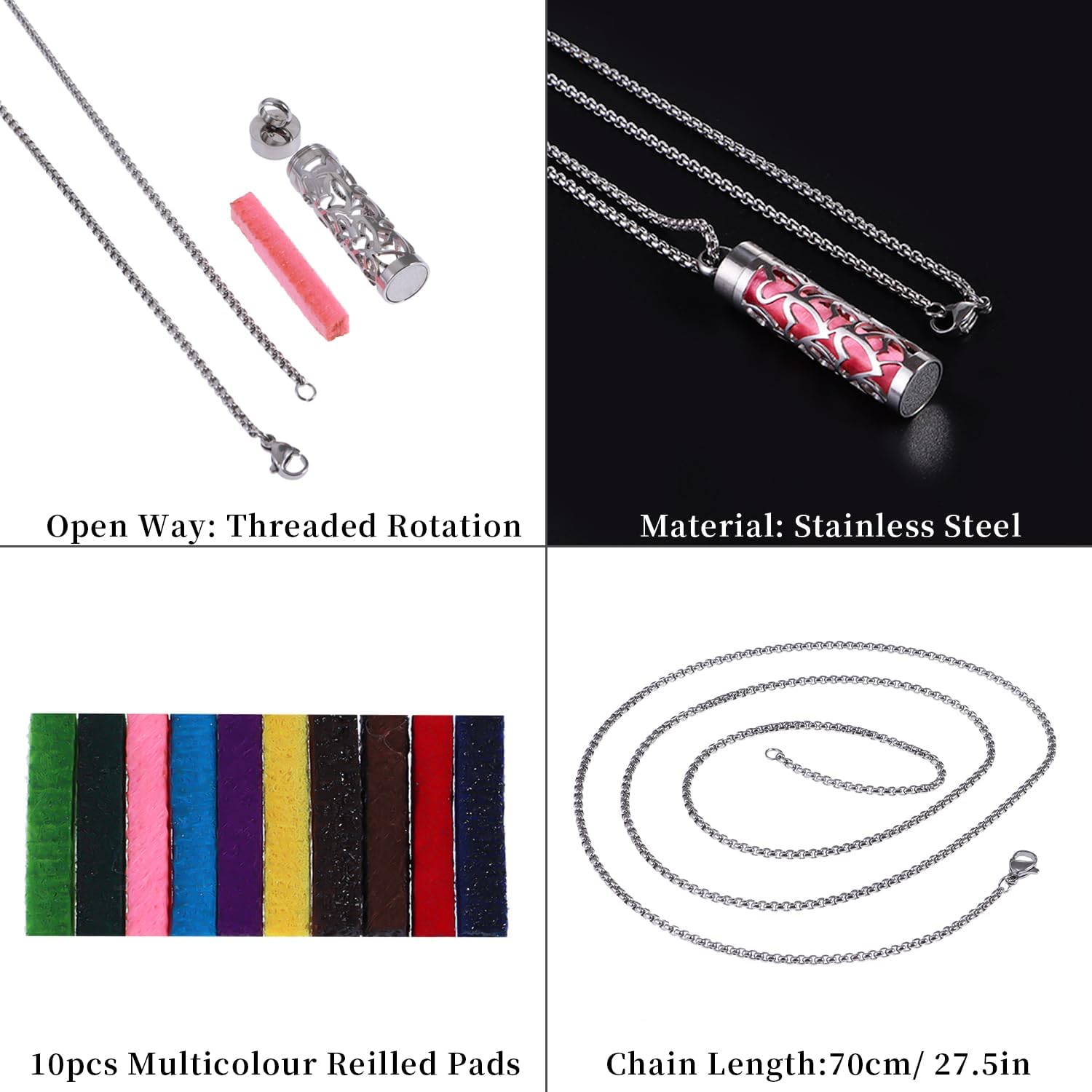Glorious Aromatherapy Expertise: Drop in your favourite important oil, stunning odor will accompany you anytime, anyplace. Every aromatherapy necklace contains 10 multicolored reusable, washable and extremely absorbent artificial felt refill pads. Totally different colour refilled pads can also distinguish totally different scents and match totally different types of clothes!