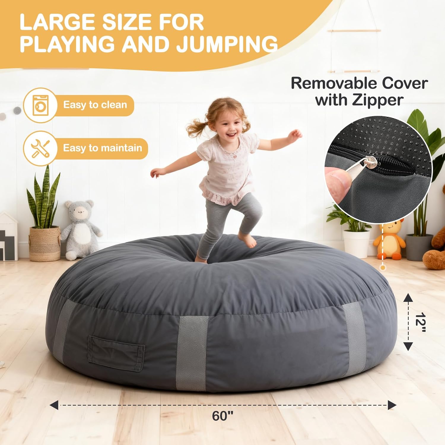 Simple-Clear Airflow Design: 4FT/5FT accommodates numerous actions. 8 air flow holes promote airflow and speed up rebound. The sensory pad cowl incorporates a sturdy zipper, is detachable and machine-washable. The outer material resists stains and wipes clear simply with a moist fabric for hassle-free upkeep