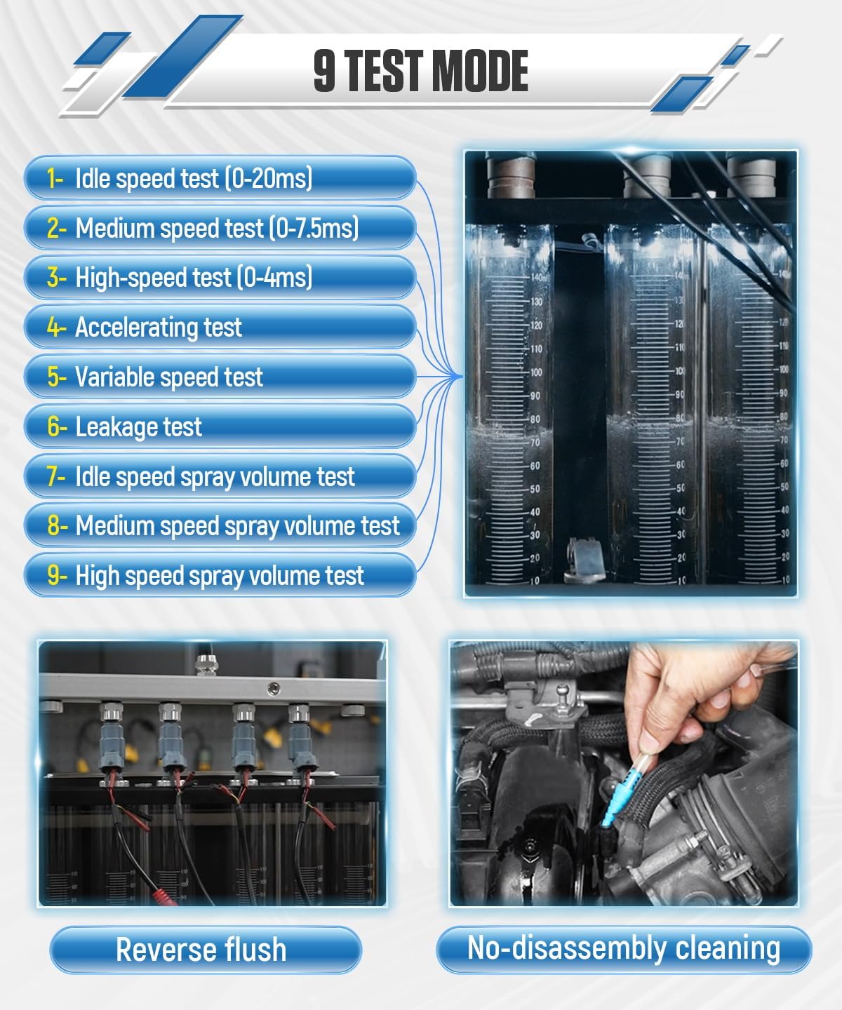 【Clever Gas Injector Tester】Our gasoline injector tester makes use of microcomputer oil stress closed-loop management detection know-how to simulate numerous working circumstances of the engine to detect the injector’s atomization, dripping, clogging, injection angle standing, and the injection quantity and uniformity of every injector at completely different speeds.