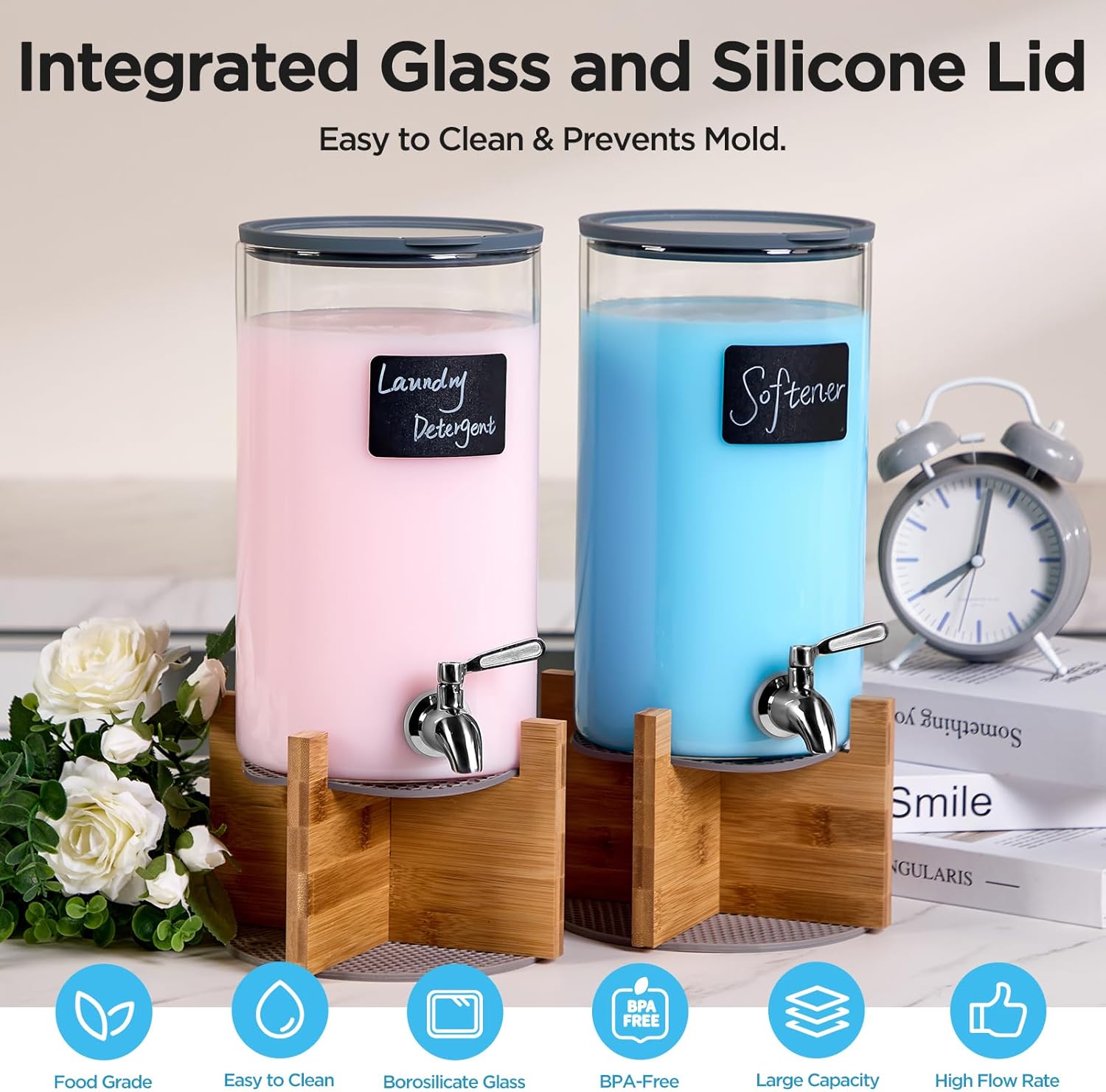 【Safe Glass Lid】Spreccio glass laundry detergent dispenser incorporates a safe silicone glass lid that enhances its visible enchantment whereas successfully preserving the freshness and efficacy of the detergent. The design ensures simple utilization each time.