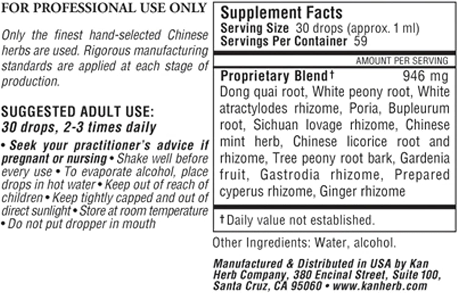Relaxed Wanderer 1 ozKan Herbals Dietary Complement Elements Dong quai root White peony root White atractylodes rhizome Poria Bupleurum root Sichuan lovage rhizome Chinese language mint herb Chinese language licorice root Tree peony root bark Gardenia fruit Gastrodia rhizome Cyperus rhizome Dried ginger rhizome(Dang gui shen Bai shao Bai zhu Fu ling kuai Chai hu Chuan xiong Bo he Gan cao Mu dan pi Zhi zi (shan) Tian ma Xiang fu Gan jiang)Water 55% to 65% by volumeAlcohol 18% to 22% by volumeTo evaporate alcohol place drops in sizzling water. Advisable Grownup Dosage8-16 drops 2-3 instances every day Shake nicely earlier than each use. Use solely as directed by your well being care skilled and search their recommendation if pregnant or nursing.Hold out of attain of kids.Hold tightly capped and out of direct daylight.Retailer at room temperature. HISTORICAL ANTECEDENT Xiao Yao San Solely the best hand-selected Chinese language herbs are used. Rigorous manufacturing requirements are utilized at every stage of manufacturing.