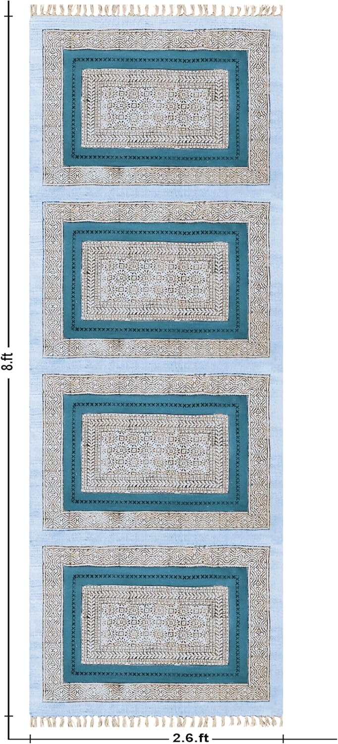 Handmade Cotton Kilim Rug – Conventional Block Print Design This superbly handcrafted cotton Kilim rug is woven on conventional Indian looms and options intricate block printing utilizing hand-carved wood blocks. Designed for versatility, it is a wonderful selection to your dwelling, workplace entrance, bed room, front room, children’ room, eating space, kitchen, or out of doors areas like patios, terraces, seashores, or gardens. Product Options: Materials: Cotton Material Weave Kind: Handwoven, Flat Weave Tassel Size: Roughly 4-6 cm Utilization: Ideally suited as an entrance rug, bed room rug, front room rug, children’ room rug, eating room rug, kitchen rug, desk runner, hallway rug, rest room rug, doormat, patio rug, terrace rug, yoga mat, seaside rug, backyard rug, workplace rug, or salon rug. Care Directions: Hand wash individually in regular water with gentle detergent Dry naturally; keep away from machine wash Don’t bleach, wring, or iron on gildings Further Data: Every rug is crafted by expert artisans utilizing conventional methods. In consequence, slight variations in design and shade could happen, enhancing its distinctive handmade attraction. Colours could seem barely totally different as a result of lighting circumstances and display settings. For customized measurement and shade inquiries, be happy to succeed in out
