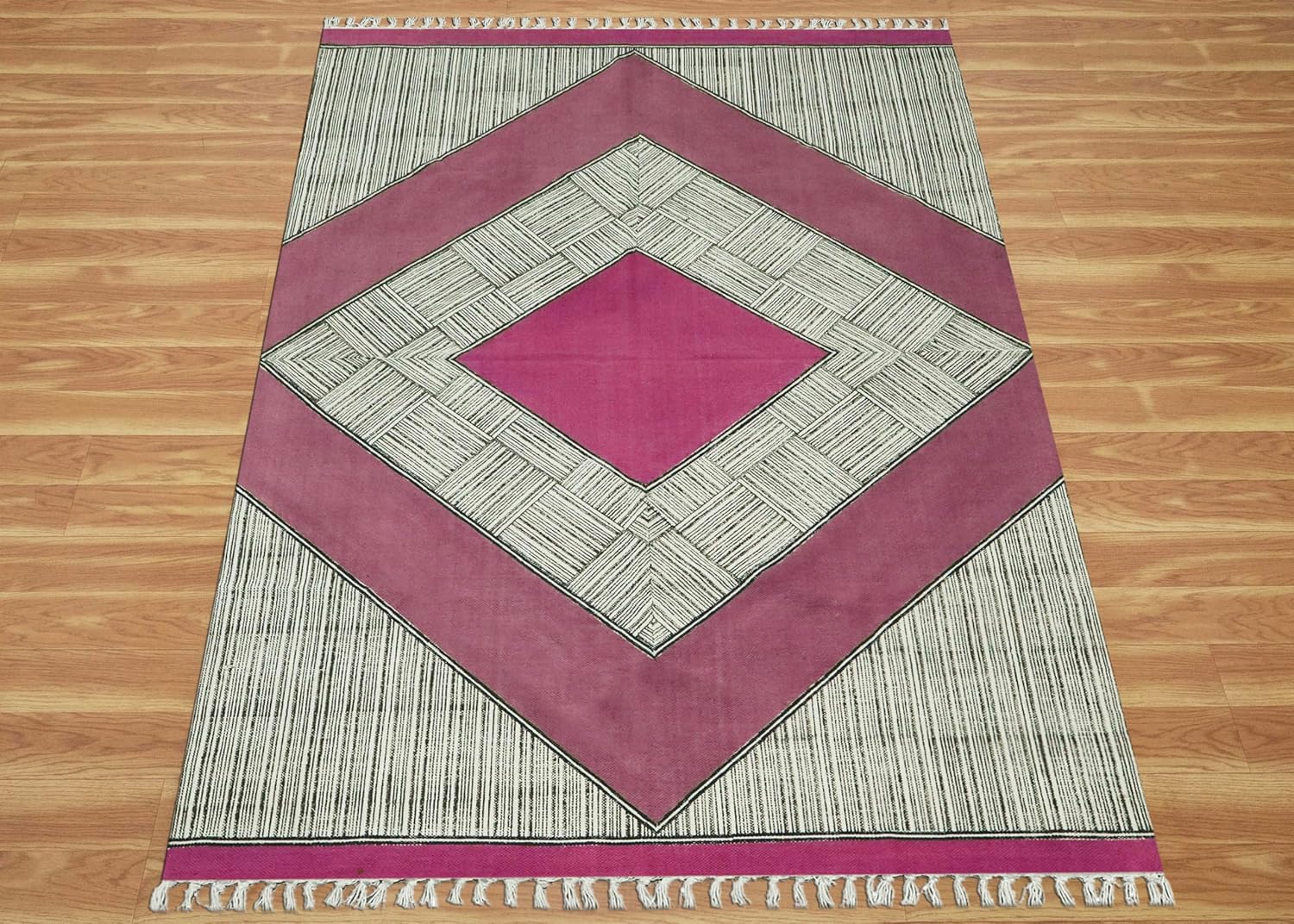 Handmade Cotton Kilim Rug – Conventional Block Print Design This superbly handcrafted cotton Kilim rug is woven on conventional Indian looms and options intricate block printing utilizing hand-carved picket blocks. Designed for versatility, it is a wonderful alternative on your residence, workplace entrance, bed room, lounge, youngsters’ room, eating space, kitchen, or outside areas like patios, terraces, seashores, or gardens. Product Options: Materials: Cotton Material Weave Kind: Handwoven, Flat Weave Tassel Size: Roughly 4-6 cm Utilization: Supreme as an entrance rug, bed room rug, lounge rug, youngsters’ room rug, eating room rug, kitchen rug, desk runner, hallway rug, lavatory rug, doormat, patio rug, terrace rug, yoga mat, seaside rug, backyard rug, workplace rug, or salon rug. Care Directions: Hand wash individually in regular water with gentle detergent Dry naturally; keep away from machine wash Don’t bleach, wring, or iron on gildings Extra Data: Every rug is crafted by expert artisans utilizing conventional strategies. In consequence, slight variations in design and colour could happen, enhancing its distinctive handmade appeal. Colours could seem barely completely different on account of lighting situations and display screen settings. For customized dimension and colour inquiries, be happy to succeed in out