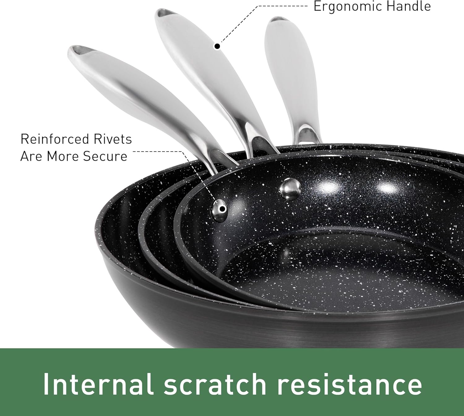 This cookware set consists of 7.8 inch 9.5 inch & 11 inch Nonstick Frying Pans, superb for browning, searing, and pan-frying meals like eggs, greens, and meats Its flat floor and flared aspect partitions make it superb for one hand sautéing and straightforward turning with a spatula.