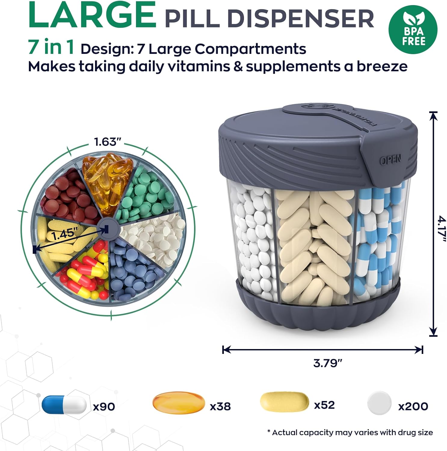 ANTI-MIX DESIGN KEEPS PILLS SEPARATED: Every compartment on this tablet organizer is tightly sealed to forestall capsules from mixing throughout use. No extra pouring out a large number of blended dietary supplements. Compact but roomy, this tablet dispenser replaces a number of containers with one neat, travel-ready bottle. Nice for on a regular basis use, particularly for seniors or busy professionals.