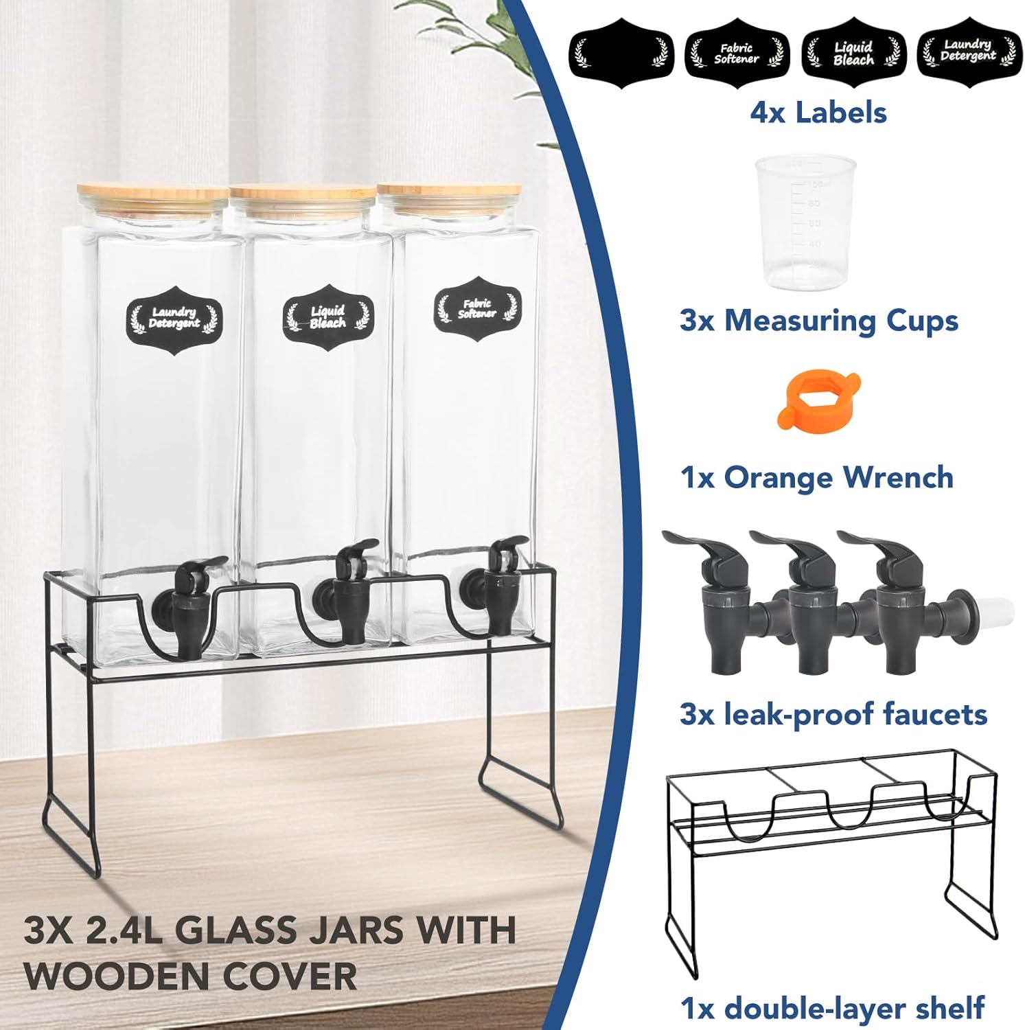 【Sensible Laundry Room Group Set】Consists of 3x 2.4L glass jars, 3x measuring cups, 3x leak-proof taps, 1x double-layer shelf, and 4x labels. These labels make categorizing your jars straightforward, sturdy metallic stand, the higher shelf is positioned to laundry detergent dispenser, and the decrease shelf is positioned with the measuring cup, which is extra handy.