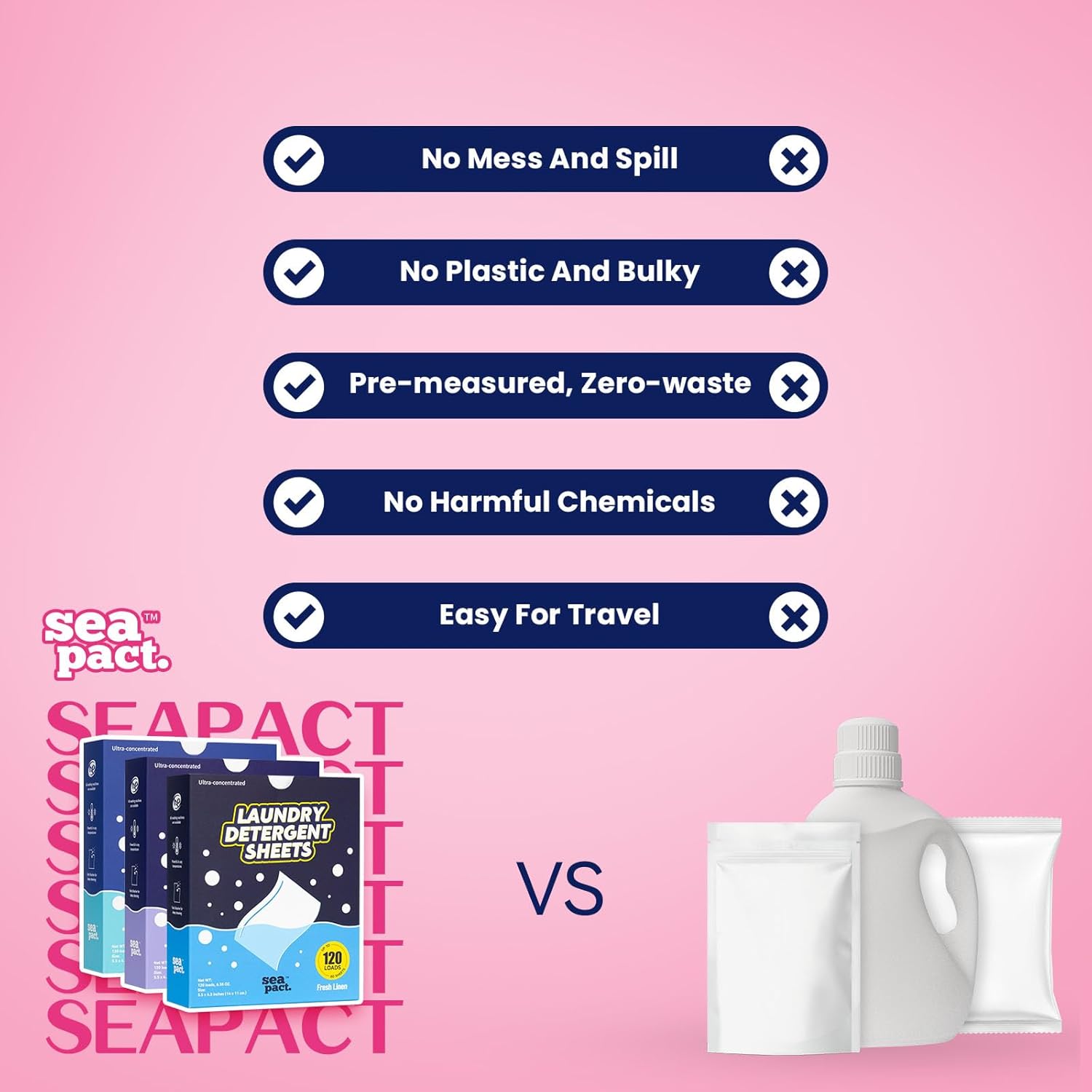 Zero-waste: this SEAPACT sheets is pre-measured which is extra space save with no-mess、no drips or spills、no-sticky and no-waste, completely exchange your laundry pods and laundry detergent liquids (laundry detergent substitutes) .