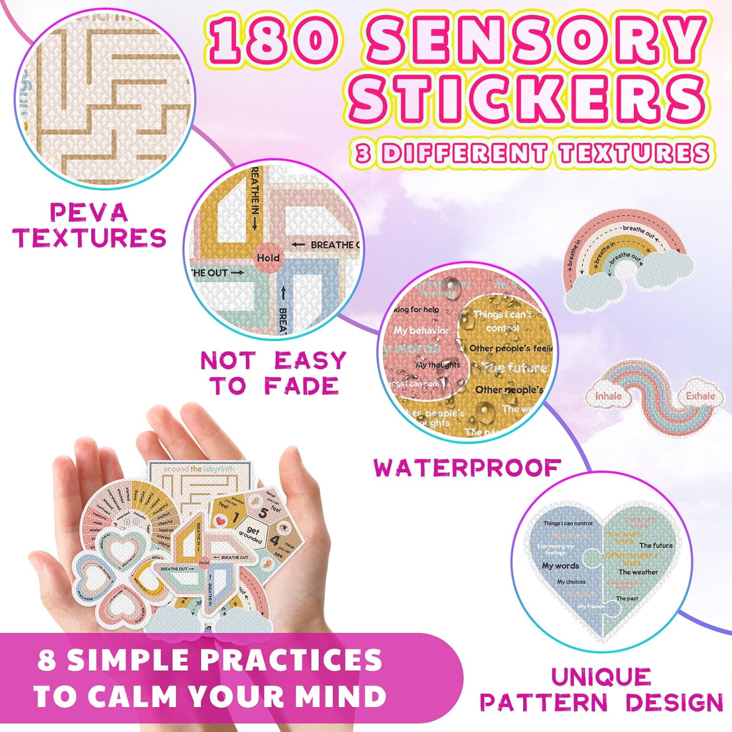 Enough Amount: the bundle incorporates 180 mindfulness stickers, offering you with loads of use and pleasure; 20 types, 9 sheets of every model, 3 completely different textures, you may distribute the nervousness sensory stickers on numerous gadgets or share with family and friends; This wealthy amount ensures that you’ve got sufficient stickers to satisfy your wants for a very long time