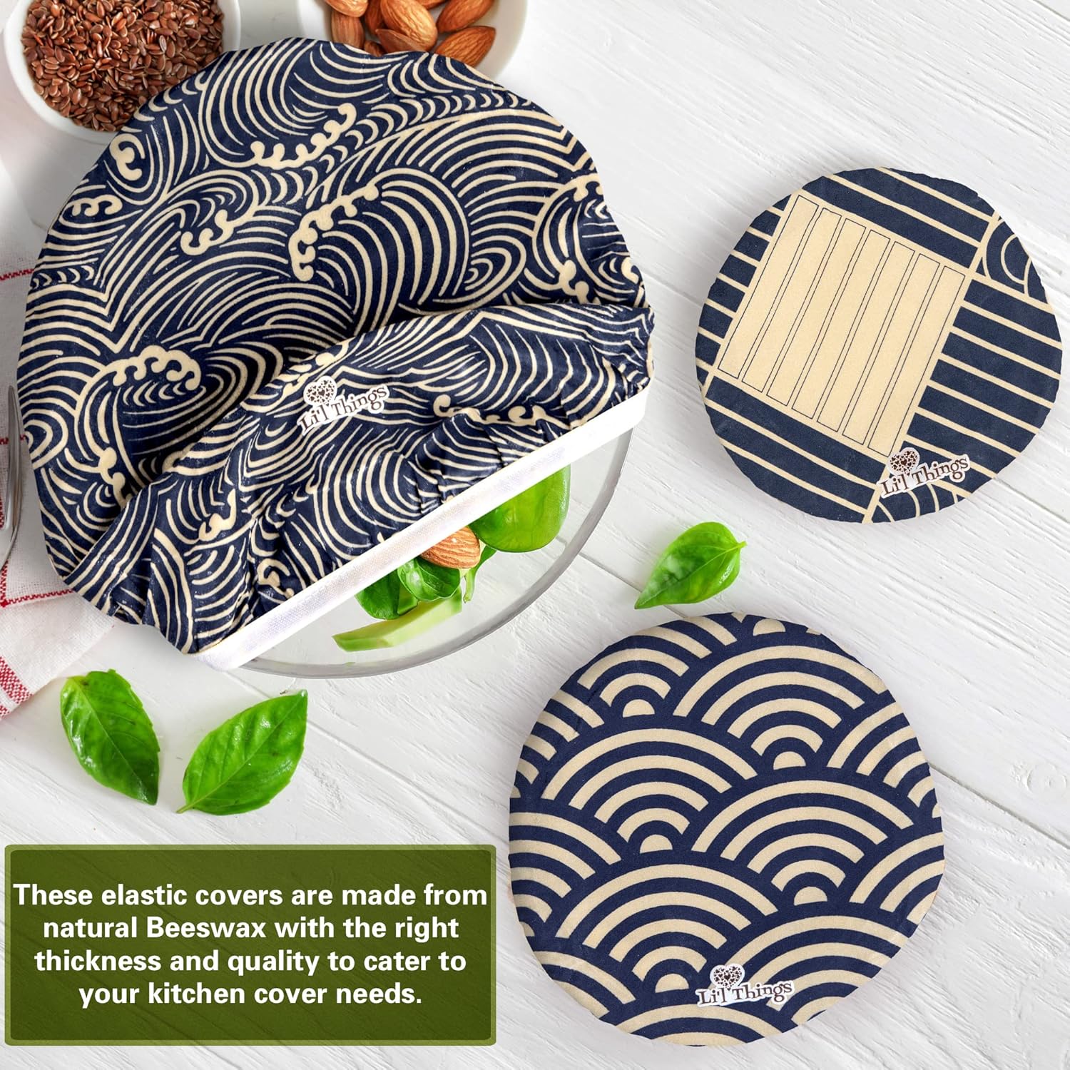 Reusable Beeswax Bowl Covers With elastic Obtainable in 5 sizes and in 5 totally different themes A Sustainable Different to plastic cling wrap and foil. (Japanese Waves)