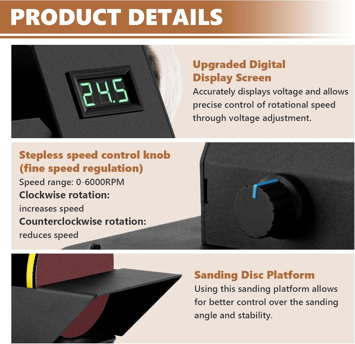 【Stepless Pace Management】: This mini bench disc sander machine has a pace adjustment knob to match any grinding want. Rotate clockwise to extend pace (0-6,000 RPM) or counterclockwise to scale back it.