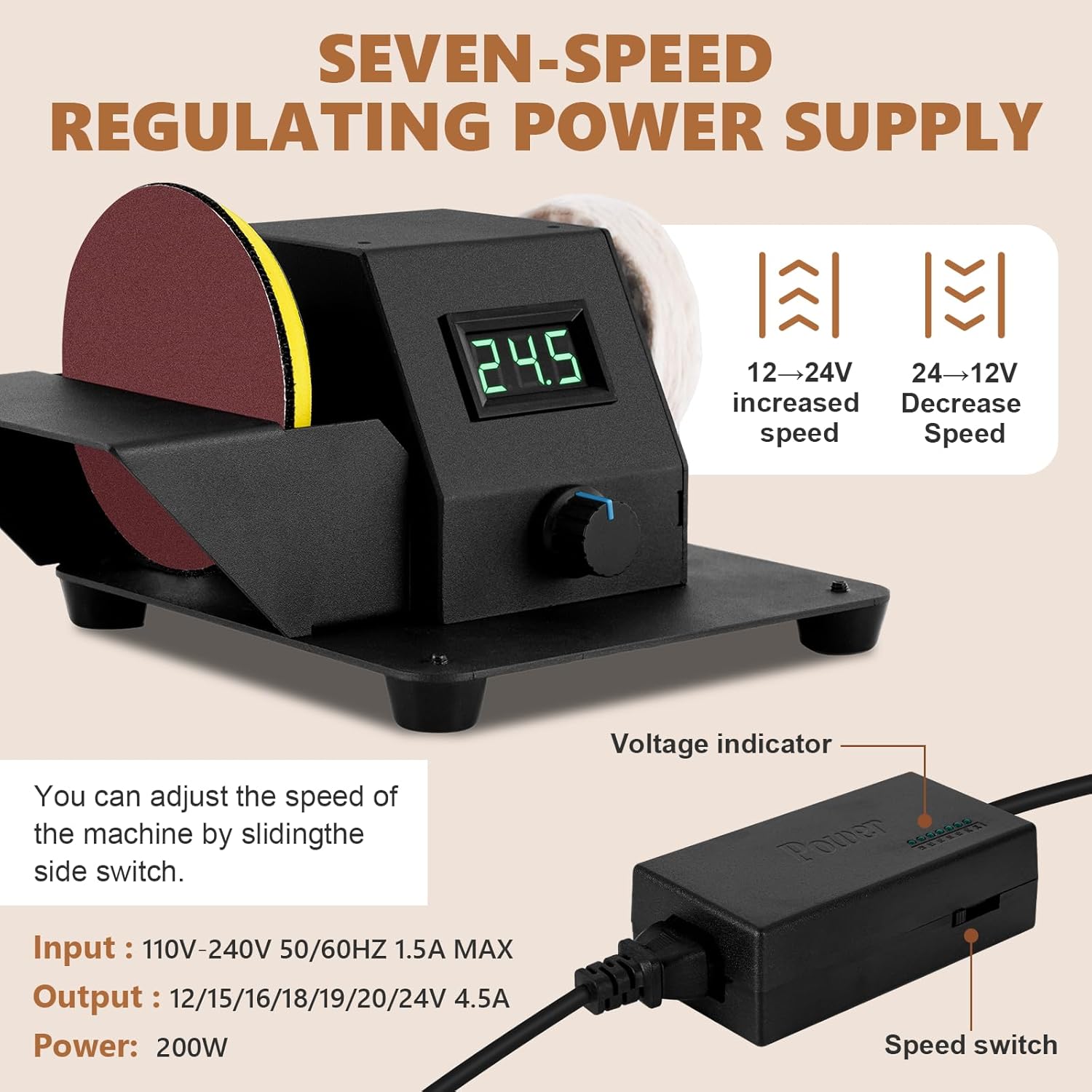 【Seven-Pace management】: You possibly can alter the pace of the bench buffer polisher machine by sliding the aspect change on the facility adapter in accordance with your sanding wants. 12→24V: Elevated pace, 24→12V: Lower Pace.