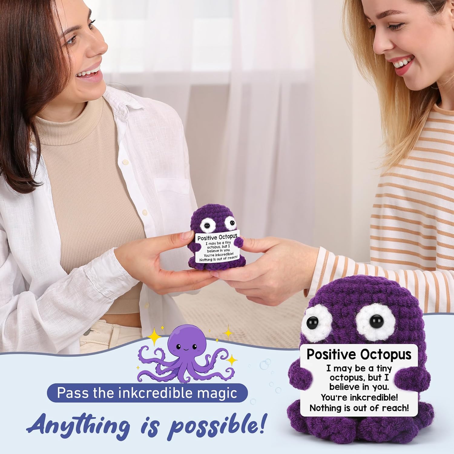 Versatile Motivational Reward for All Events -This positivity-infused octopus, with its delicate affirmations, radiates heat in each nook of life. It serves as a super get effectively quickly present, a considerate selection for the beginning of a brand new job, New 12 months’s, Valentine’s Day, and different particular moments. Appropriate as a desk ornament or a carry-along companion, it offers an uplifting reminder for buddies, household, or coworkers to maintain an optimistic outlook, even in powerful occasions