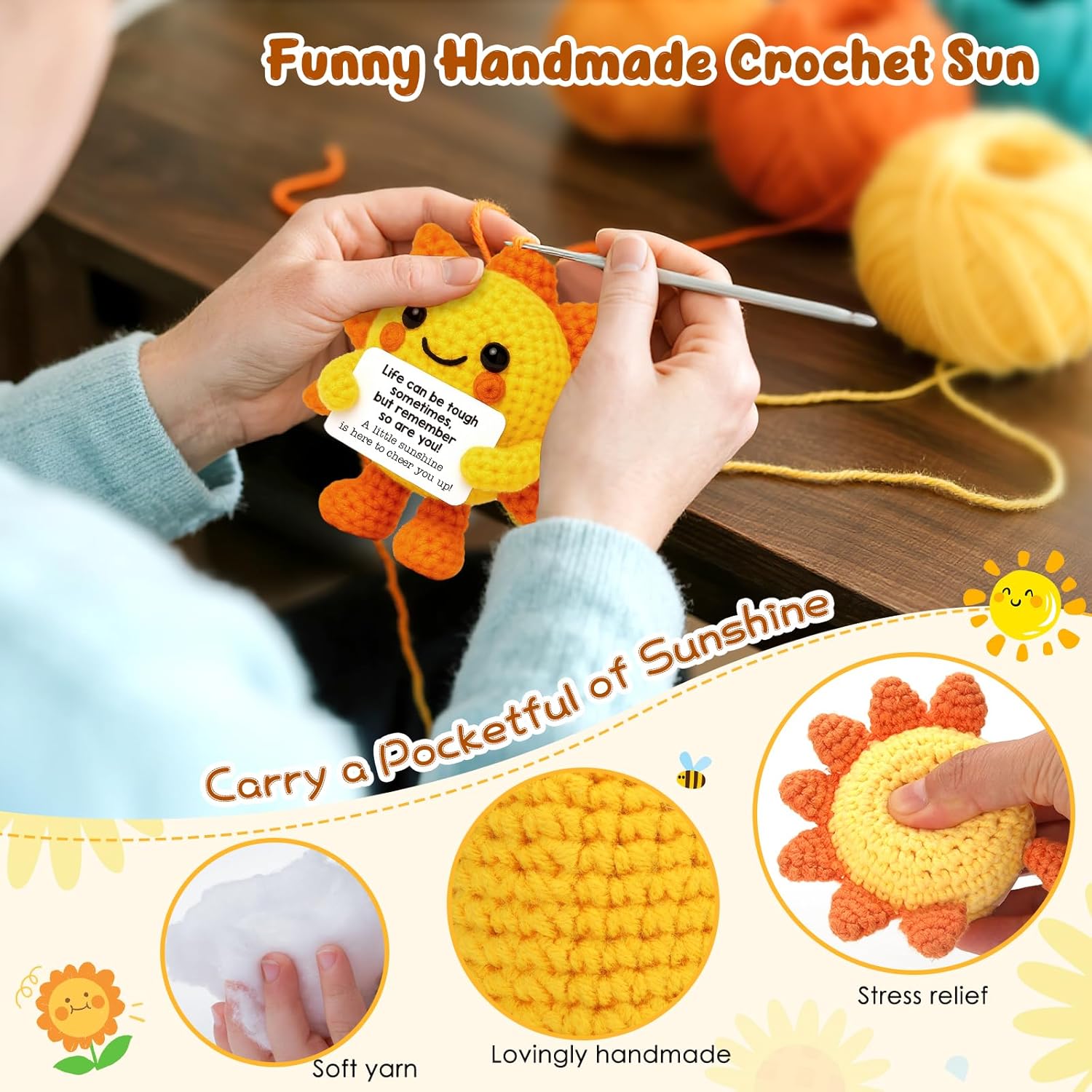Emotional Crochet Sunshine Present:This handmade sunshine comes with a heartwarming card: “Life will be robust typically, however bear in mind so are you.” A comforting emotional cheer up assist reward for anybody going through laborious days, stress, or burnout.Ship a smile with this uplifting sunshine. It’s the proper cheer up reward for ladies, buddies,or coworkers who want somewhat reminder that they’re stronger than they really feel.This small assist reward brings sunshine in gentle,handmade kind. Compact and heartfelt.
