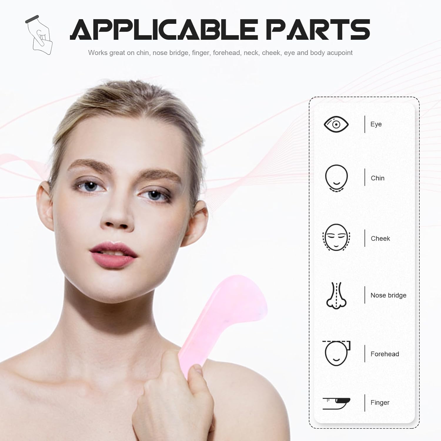 Therapeutic massage software:works nice on chin, nostril bridge, finger, brow, neck, cheek, eye acupoint,jade scraping board