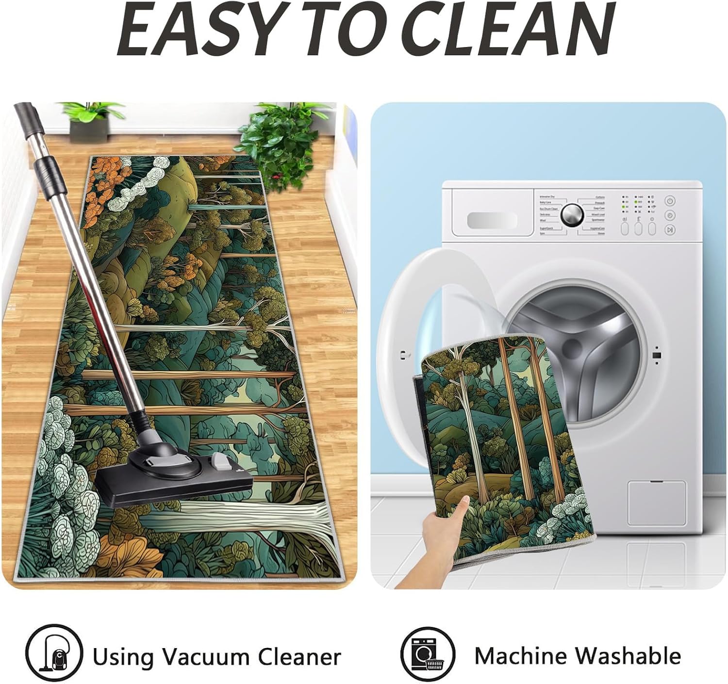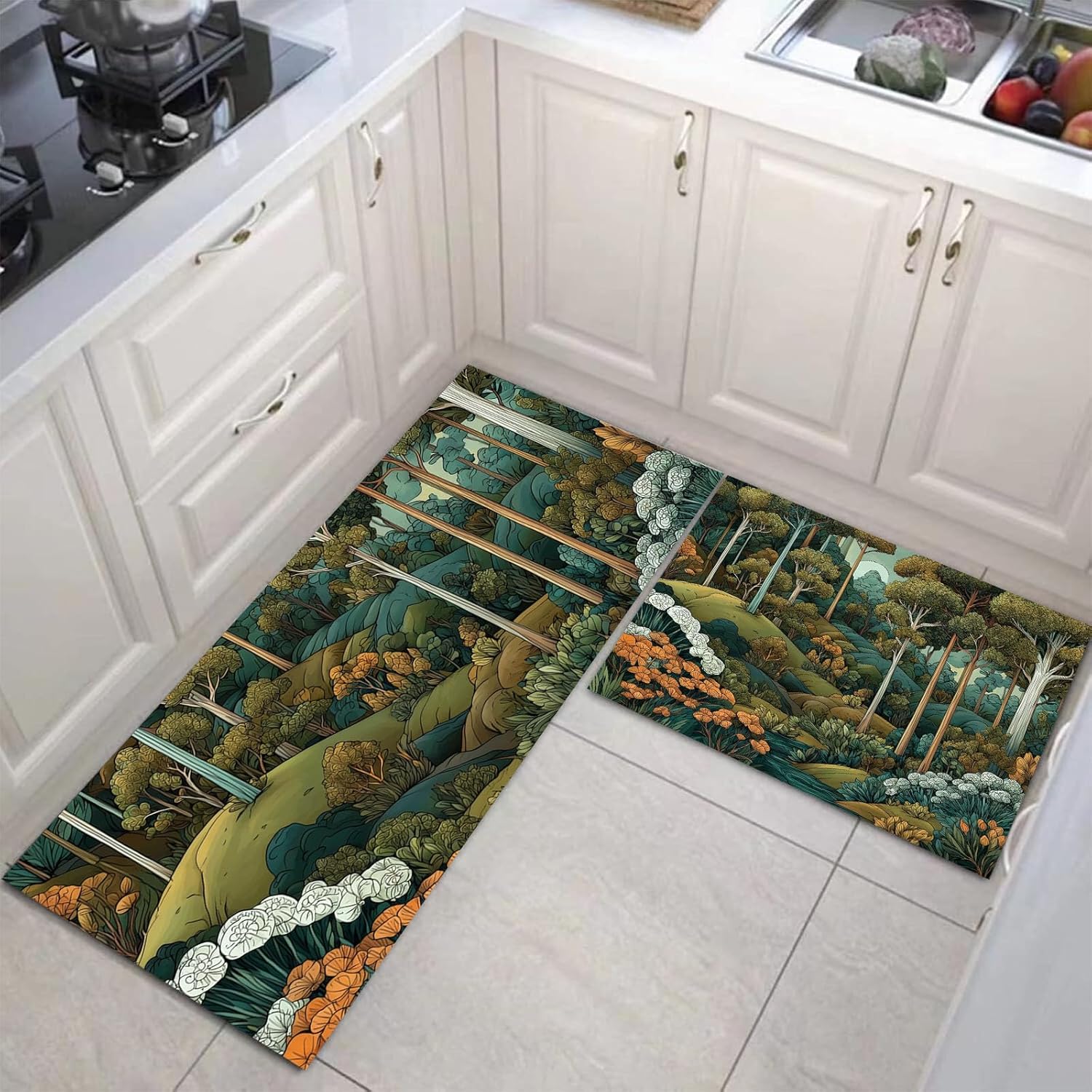 Natural Plants Kitchen Rug Sets 2 Pieces, Forest Illustration Washable Kitchen Mats for Floor, Non Slip Soft Area Rug for Laundry Room Hallway (Olive Green, 17″X29″+17″X59″)