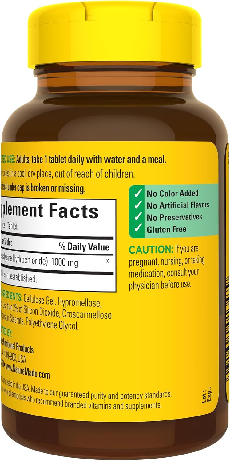 Protein synthesis help complement: Accommodates one 60 depend bottle of Nature Made L-Lysine 1000 mg Tablets for a 60-day provide
