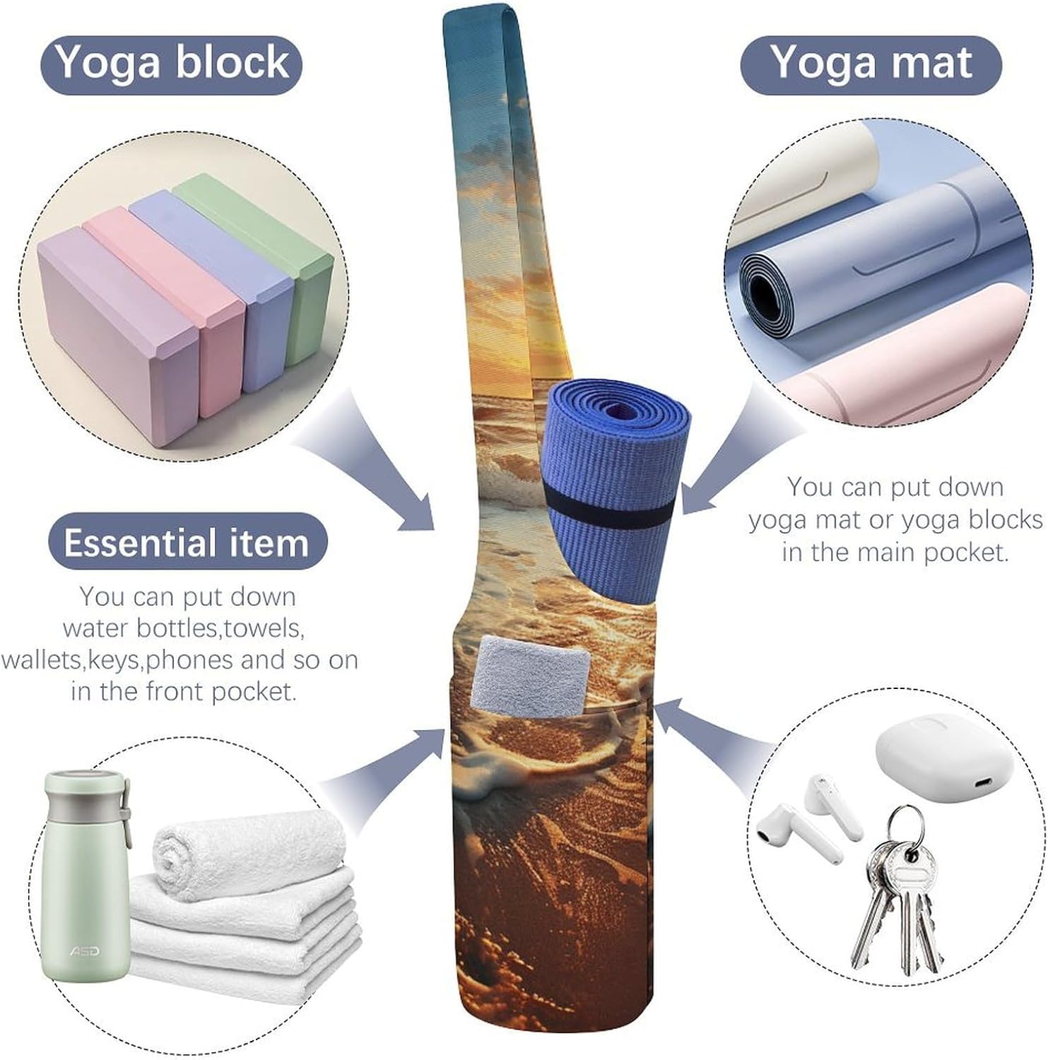 Spacious Design: The big capability of this yoga mat carrying bag accommodates mats of all thicknesses, blocks, towels, and extra, with an inside zipper pocket for valuables like telephone and keys, and an exterior pocket for water bottles or different yoga gear. Excellent for these balancing health and each day life