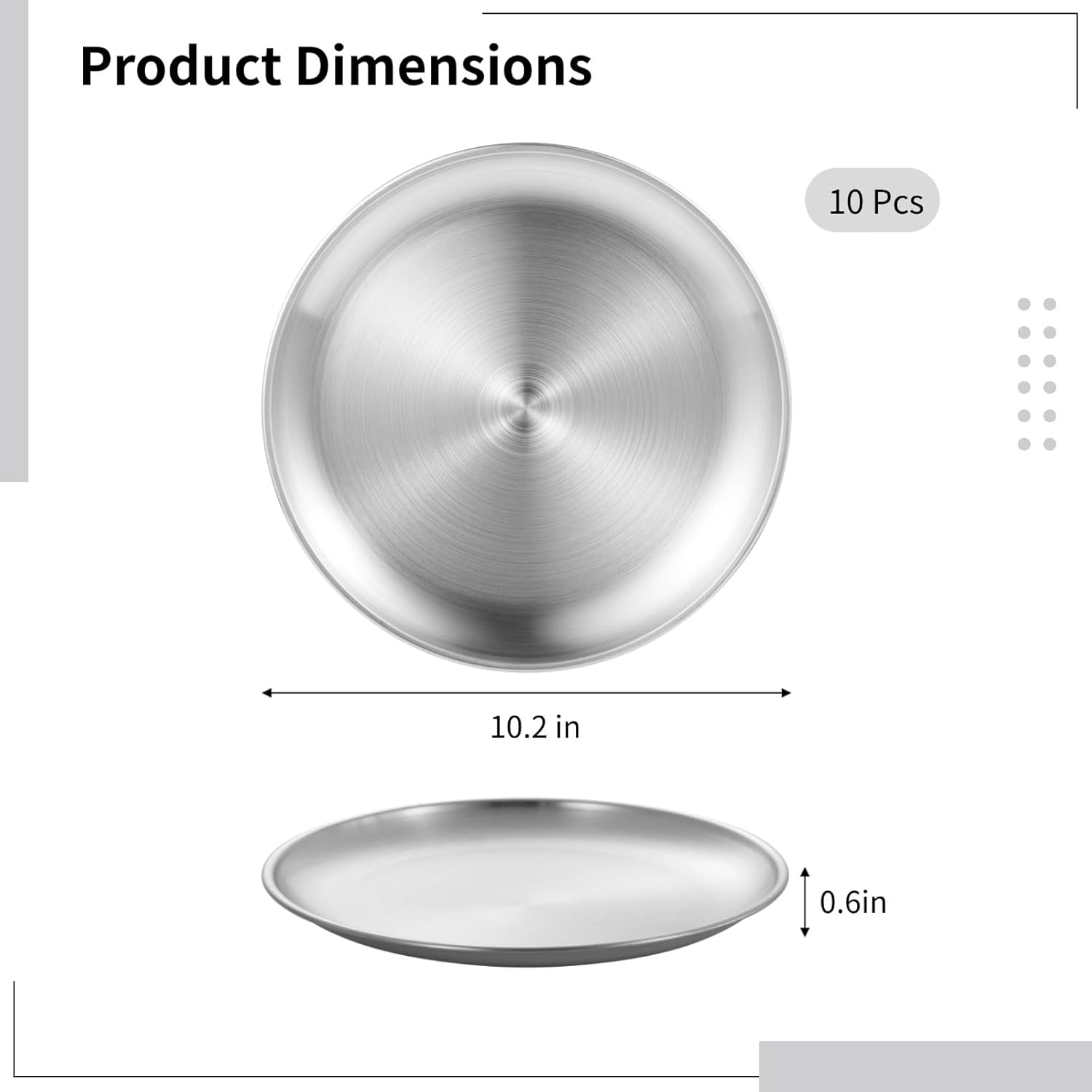 [Ample Quantity & Spacious Size] The package deal consists of 10 metallic dinner plates, providing ample amount to satisfy every day use and social gathering wants. Measuring 10.2 inches in diameter, these plates are massive sufficient to accommodate quite a lot of meals, resembling entrees, grilled meats, salads, fruits, desserts, and extra