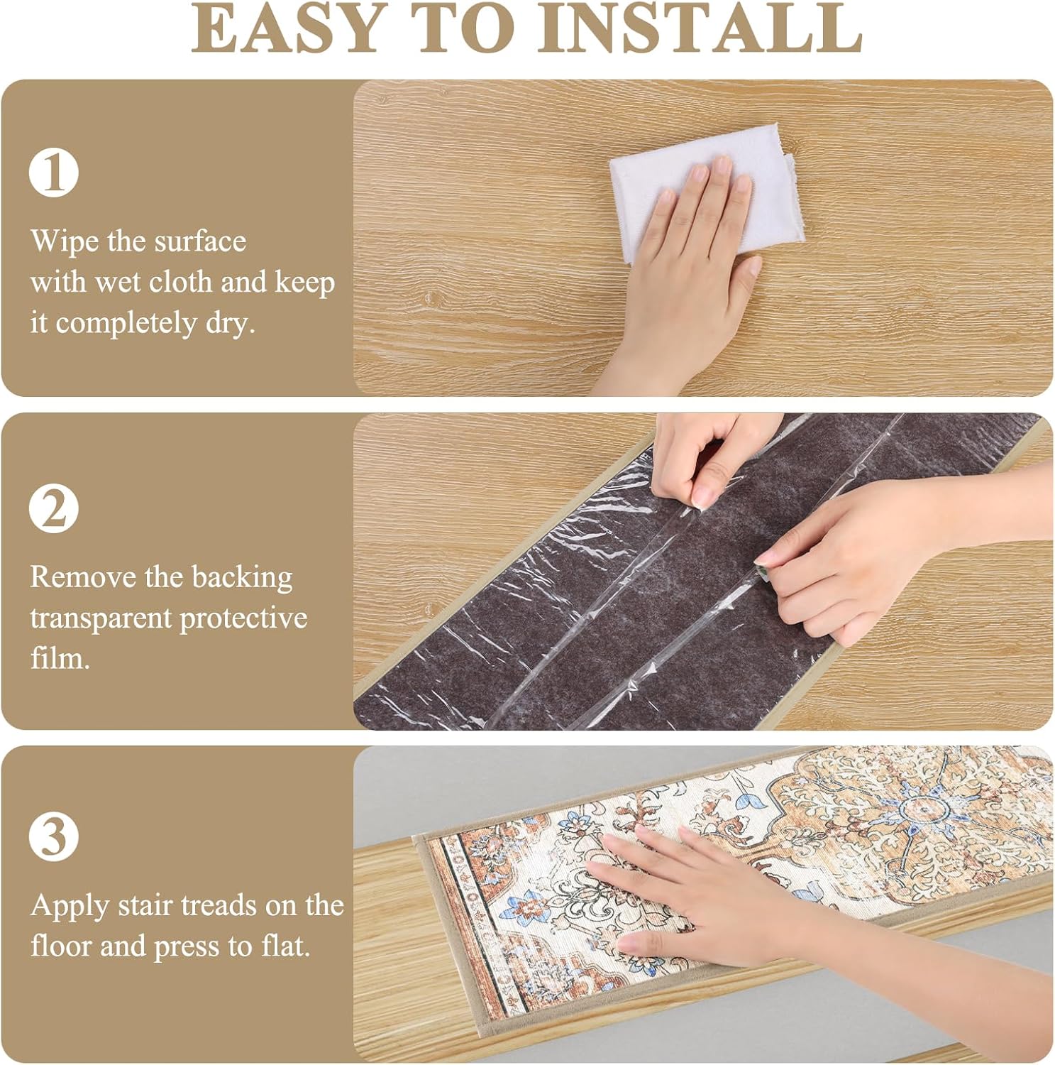 Non Slip Stair Treads Indoor: Bundle consists of stair treads non slip 15 packs, these carpet treads for wooden stairs are made from TPR self-adhesive know-how, the anti-skid backside supplies sturdy grip and permits you up and down freely. Your loved ones and your pets will not be apprehensive about stepping on stairs any extra.