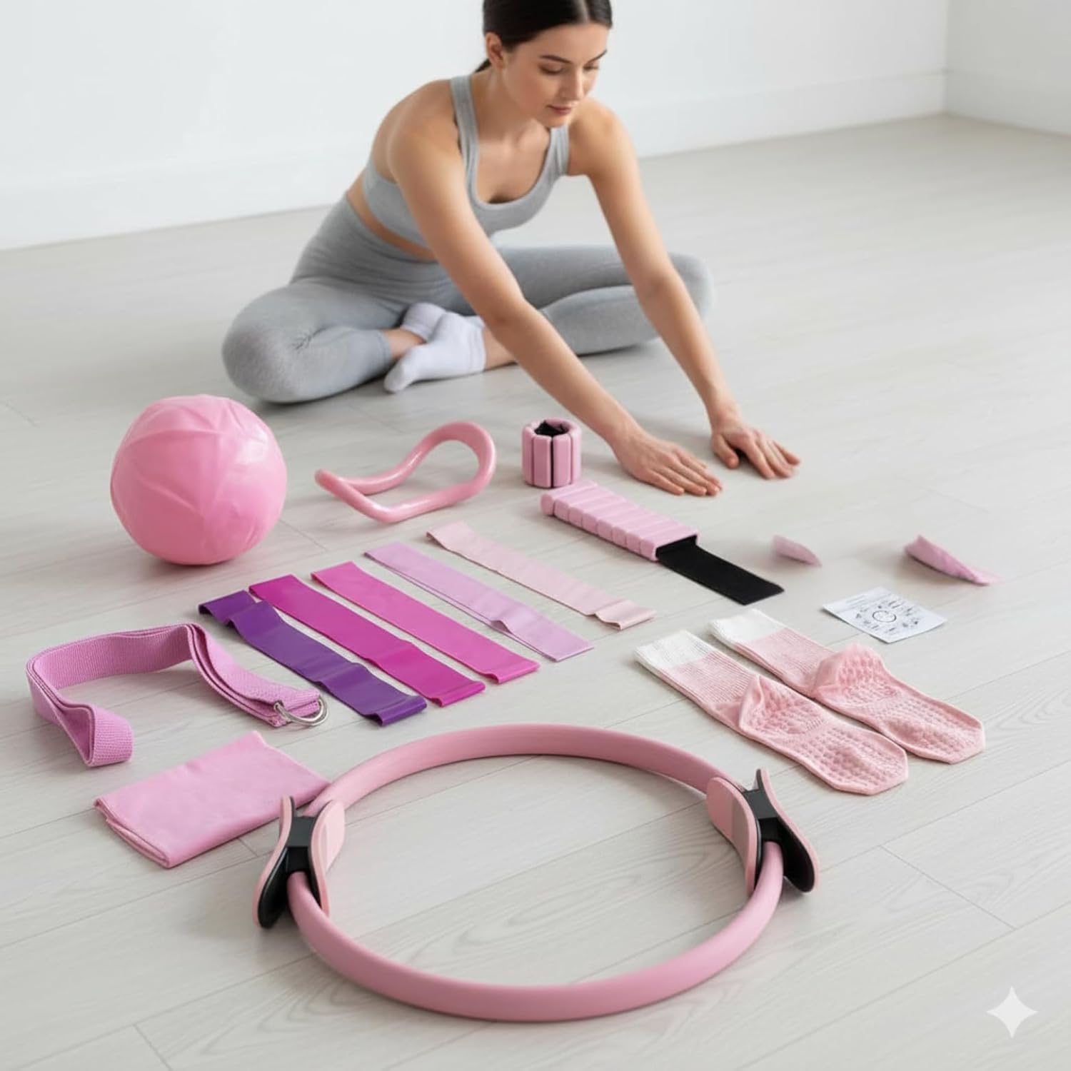 COMPLETE SET: 14-piece Pilates gear set that includes magic circle yoga ring, Pilates ball, adjustable weights, resistance bands, grip socks, and instruction guide