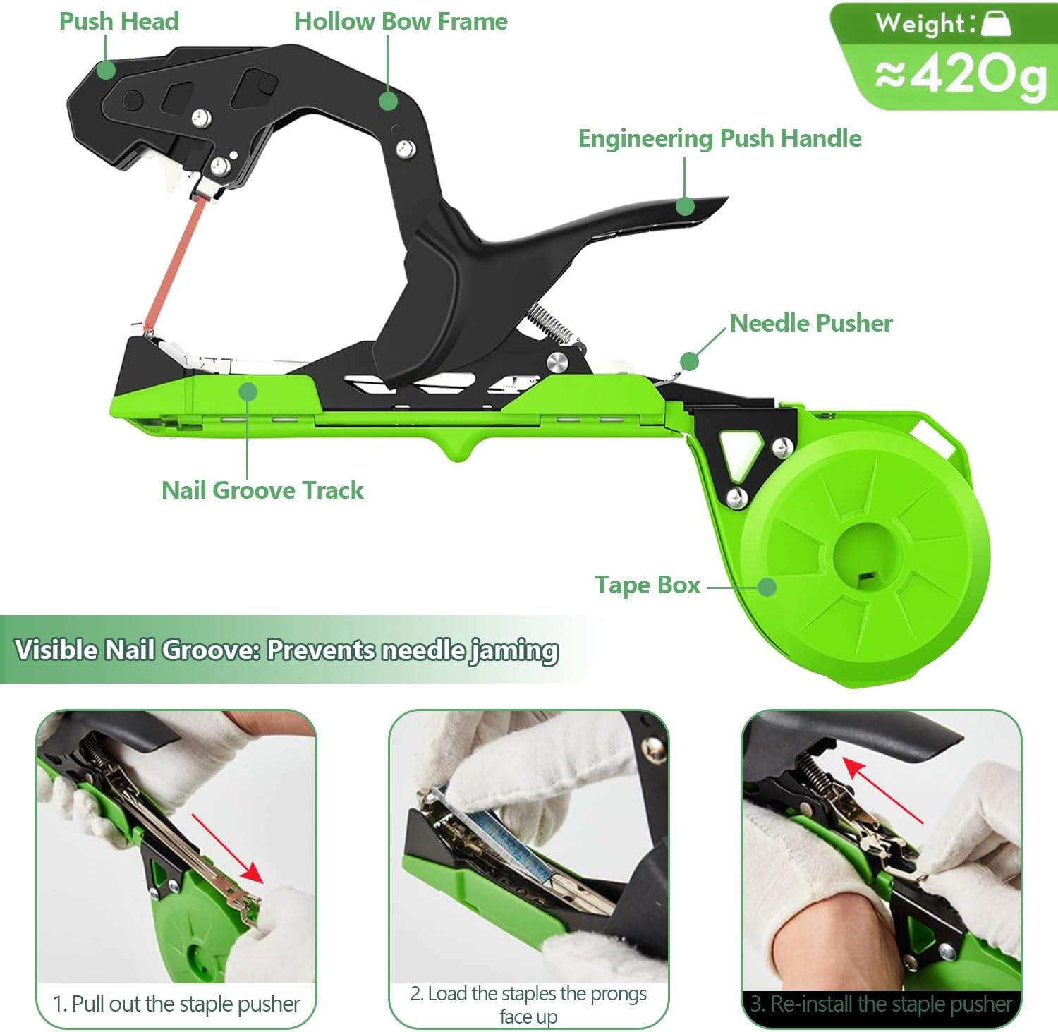 【Enhanced Reduce Head Construction】This tying tape machine options the disassembly-free push pin design. Seen staple slot makes it simpler to position and output the backyard staples.