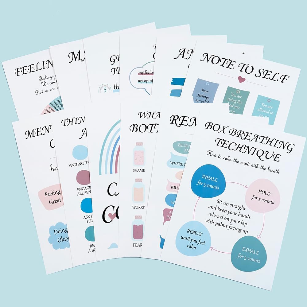 Emotionally Supportive Visible Toolkit:Curated with 12 distinctive themes (Reminders, Wholesome, Anxiousness Reminders, and many others.), By the presentation of visible artwork,these psychological well being exploration & administration posters act as each day mindfulness anchors. Specifically Designed to helps customers discover and handle their feelings.Vibrant designs foster self-expression, rebuild resilience– permits individuals to raised address nervousness and stress in each day life.